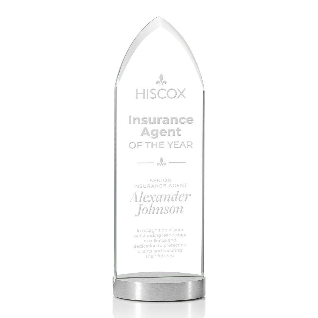 The elegant starfire crystal Oakham Award features a sleek, pointed design mounted on an aluminum base for a modern, distinguished look. Its clear, polished surface provides the perfect backdrop for deep etching of logos, names, and personalized messages. Ideal for recognizing exceptional achievement, leadership, or milestones, this award makes a lasting impression of prestige and honor. 3.125″ W x 7.5″ H x 3.125″ D