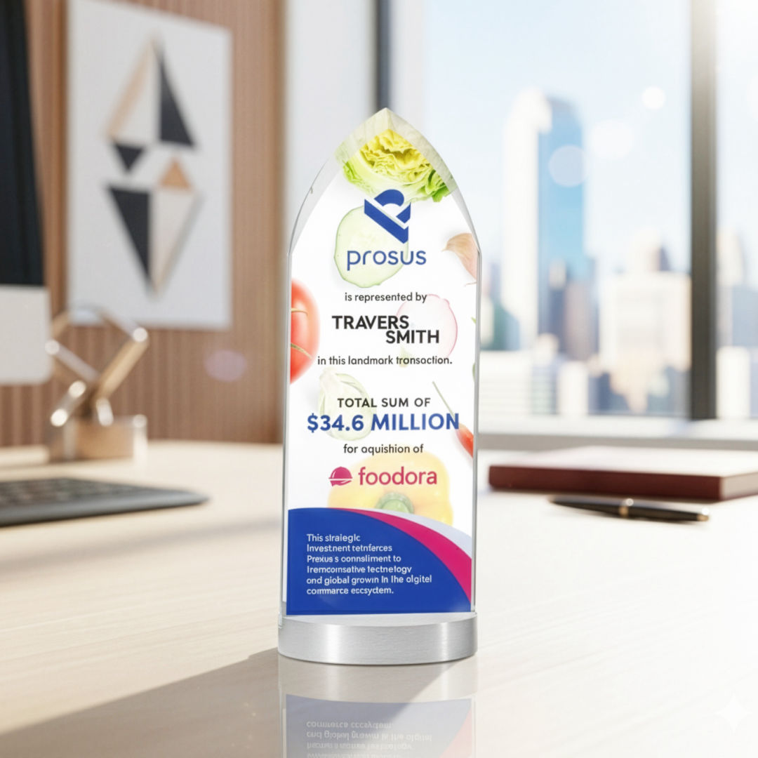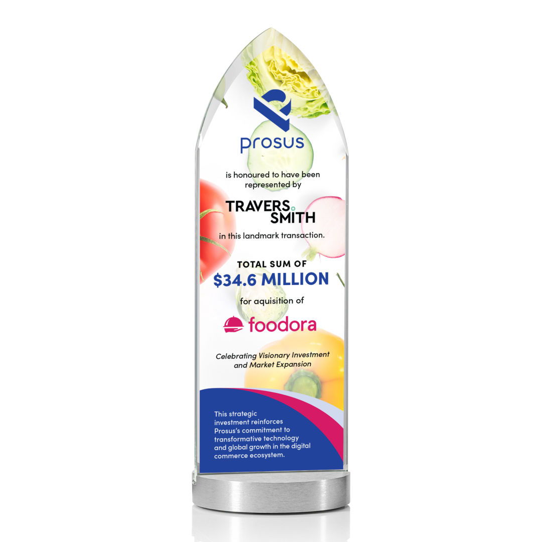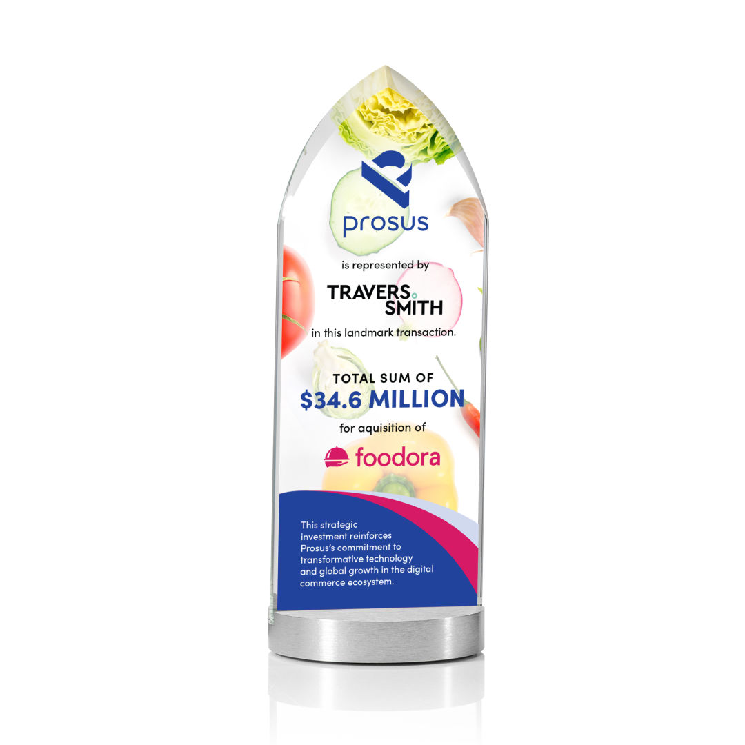 The elegant starfire crystal Oakham VividPrint™ Award features a sleek, pointed design mounted on an aluminum base for a modern, distinguished look. Its clear, polished surface provides the perfect backdrop for deep etching of logos, names, and personalized messages. Ideal for recognizing exceptional achievement, leadership, or milestones, this award makes a lasting impression of prestige and honor. Bring your artwork to life with full-color VividPrint™! 3.125″ W x 7.5″ H x 3.125″ D