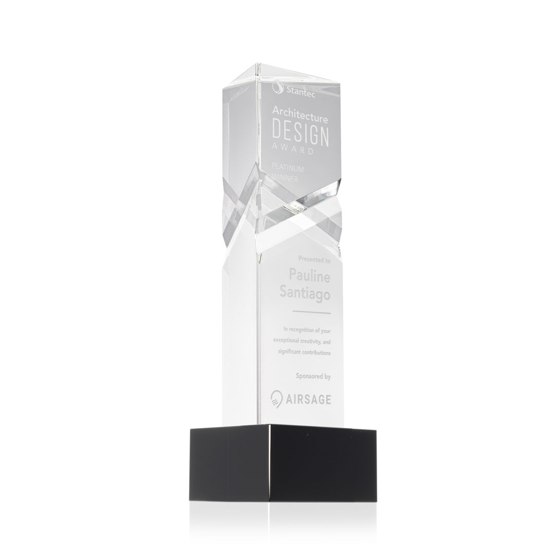 The Optical Crystal Oakham Award on base features a unique and striking design with deep, interchanging facets that catch and reflect light beautifully. Crafted from high-quality optical crystal, this award offers a sophisticated and elegant way to recognize exceptional achievements. Its unique triangular shape and impeccable clarity make it a standout piece for any ceremony or display. Second-position decoration on base optional. 2.75″ W x 8.5″ H x 2.75″ D