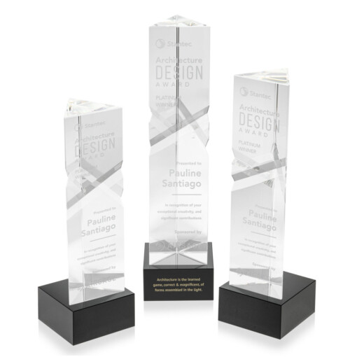 The Optical Crystal Oakham Award on base features a unique and striking design with deep, interchanging facets that catch and reflect light beautifully. Crafted from high-quality optical crystal, this award offers a sophisticated and elegant way to recognize exceptional achievements. Its unique triangular shape and impeccable clarity make it a standout piece for any ceremony or display. Second-position decoration on base optional. 2.75″ W x 8.5″ H x 2.75″ D