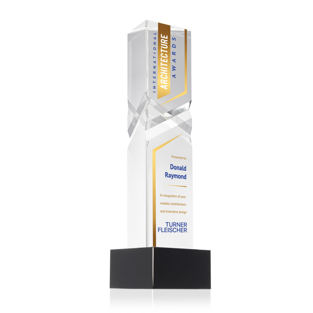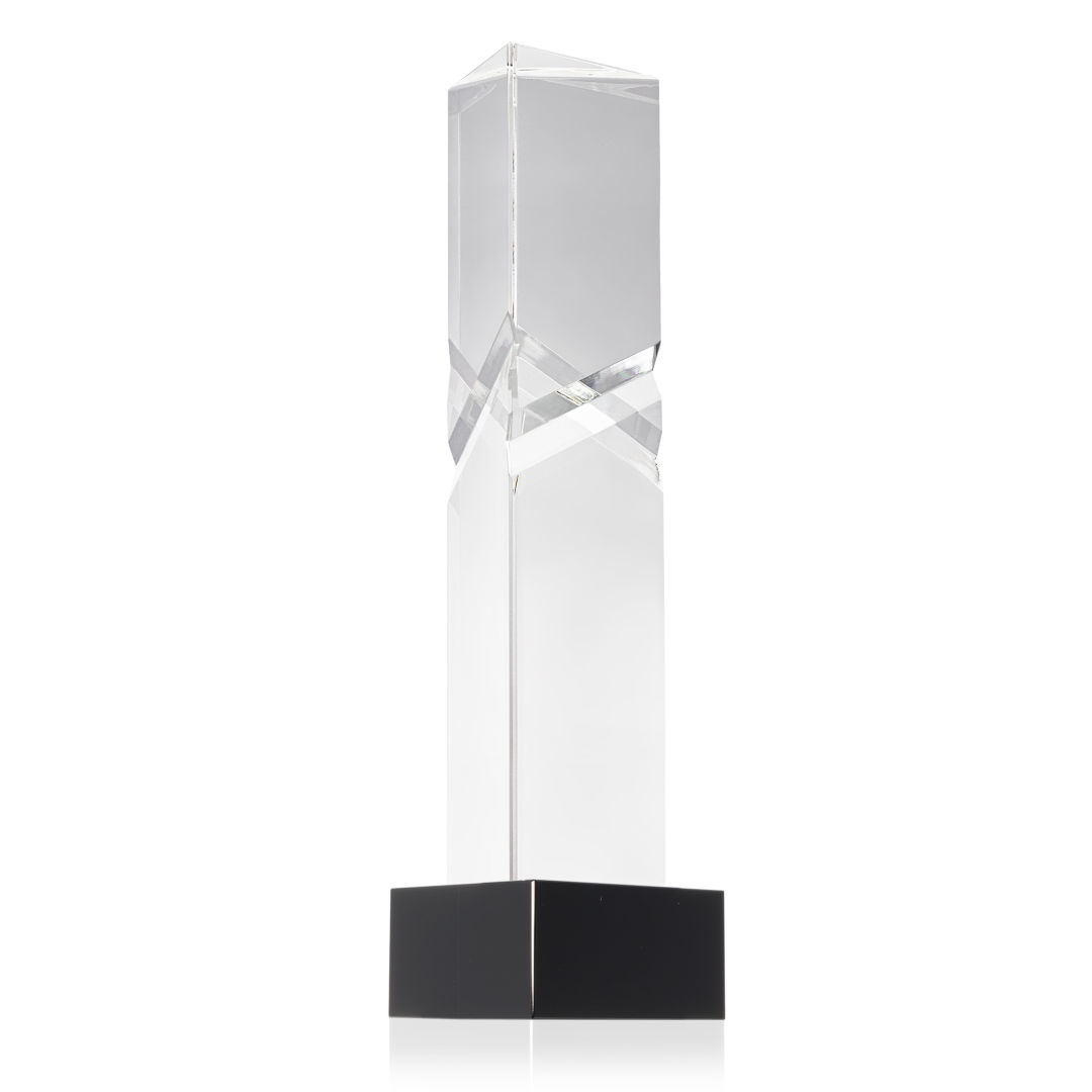The Oakham VividPrint™ Award on base features a unique and striking design with deep, interchanging facets that catch and reflect light beautifully. Crafted from high-quality optical crystal, this award offers a sophisticated and elegant way to recognize exceptional achievements. Its unique triangular shape and impeccable clarity make it a standout piece for any ceremony or display. Take your artwork to new heights with full-color VividPrint™! Second-position decoration on base optional. 2.75″ W x 8.5″ H x 2.75″ D