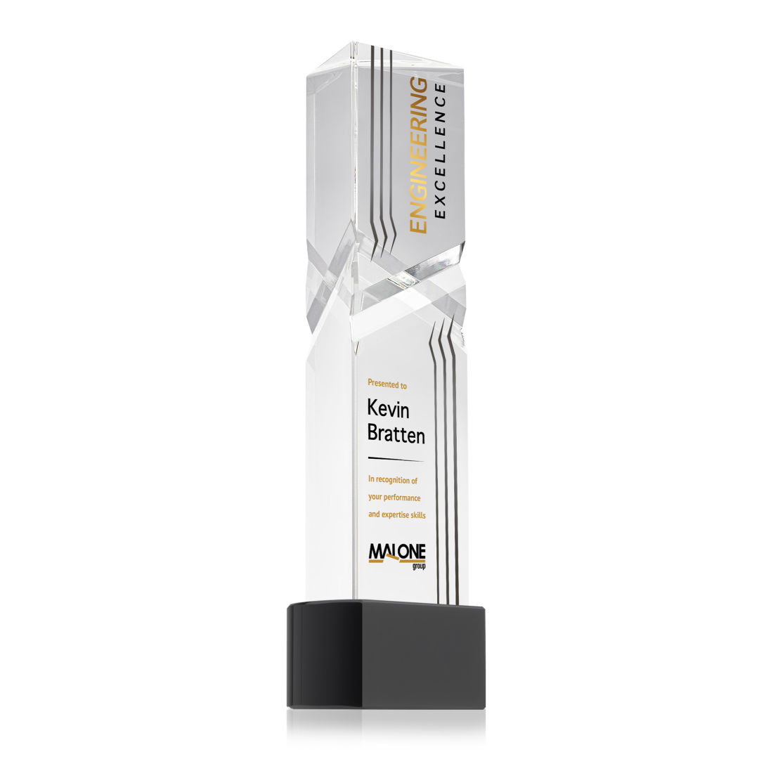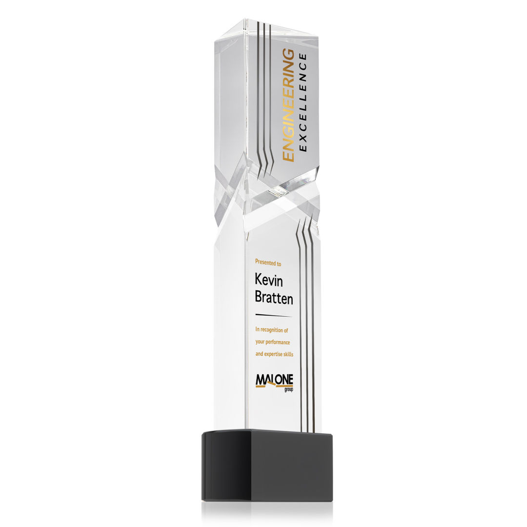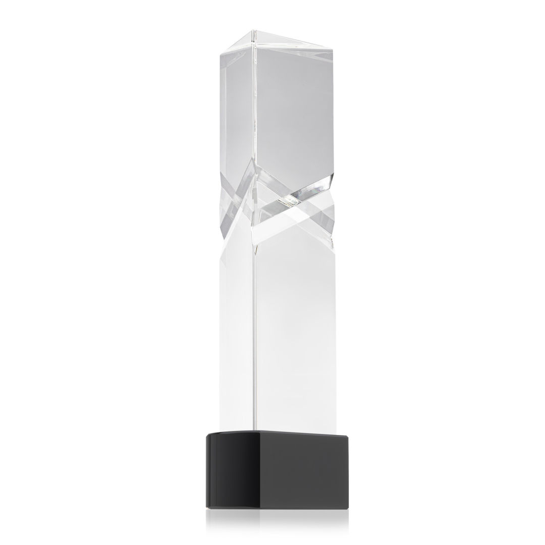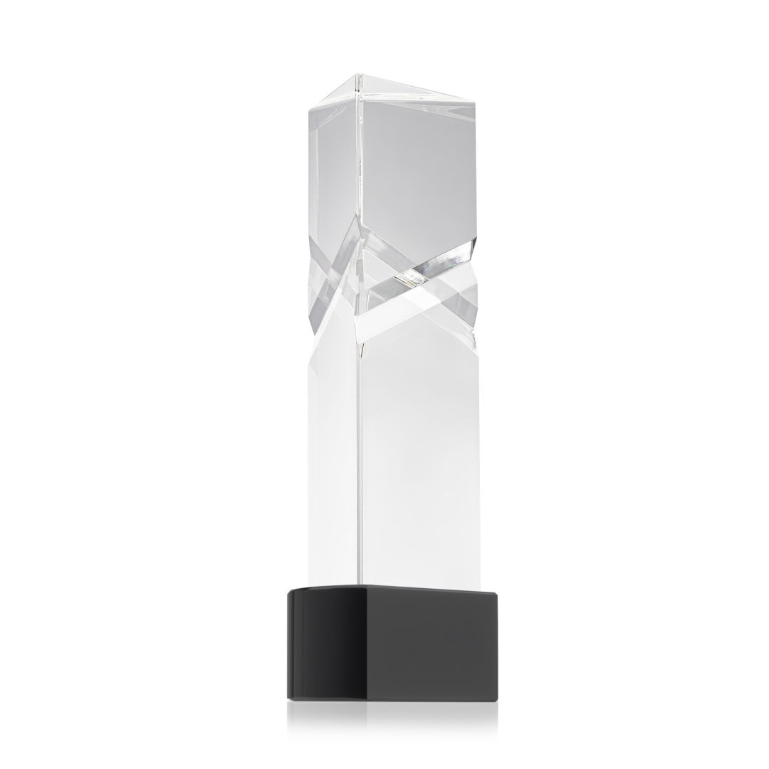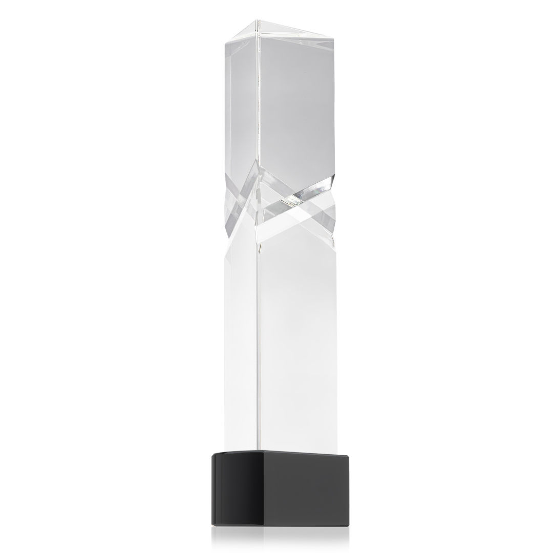 The Oakham VividPrint™ Award on base features a unique and striking design with deep, interchanging facets that catch and reflect light beautifully. Crafted from high-quality optical crystal, this award offers a sophisticated and elegant way to recognize exceptional achievements. Its unique triangular shape and impeccable clarity make it a standout piece for any ceremony or display. Take your artwork to new heights with full-color VividPrint™! Second-position decoration on base optional. 3.0″ W x 8.5″ H x 2.375″ D