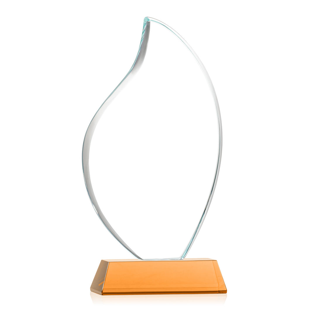 This classic award features a 3/4″ thick Starfire Crystal Flame with rounded edges and mounted on your choice of clear or colored tall tapered Optical Crystal Newhaven Base. An elegant award to recognize a great achievement or momentous event. Packaged in a black satin-lined presentation gift box. Second position etch and colorfill optional. 4.0″ W x 8.125″ H x 2.0″ D