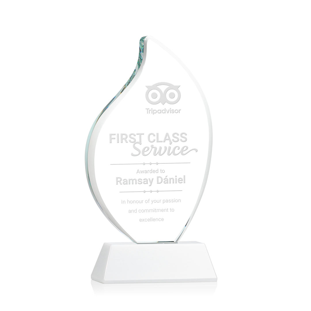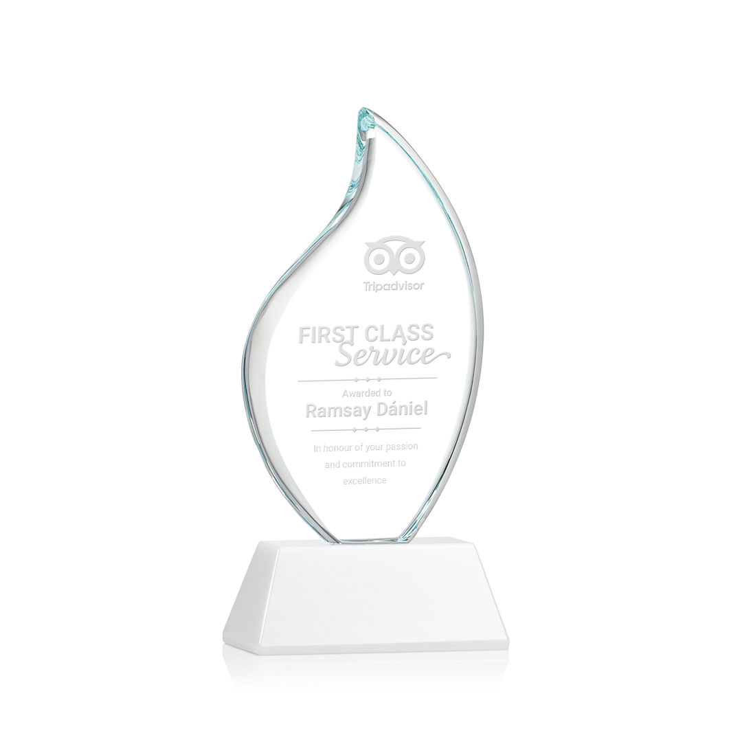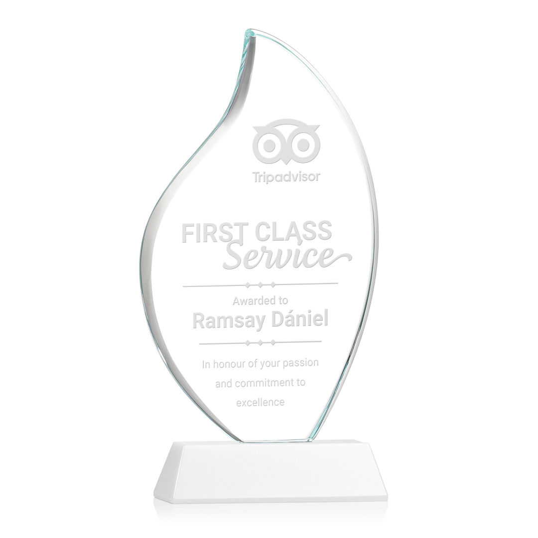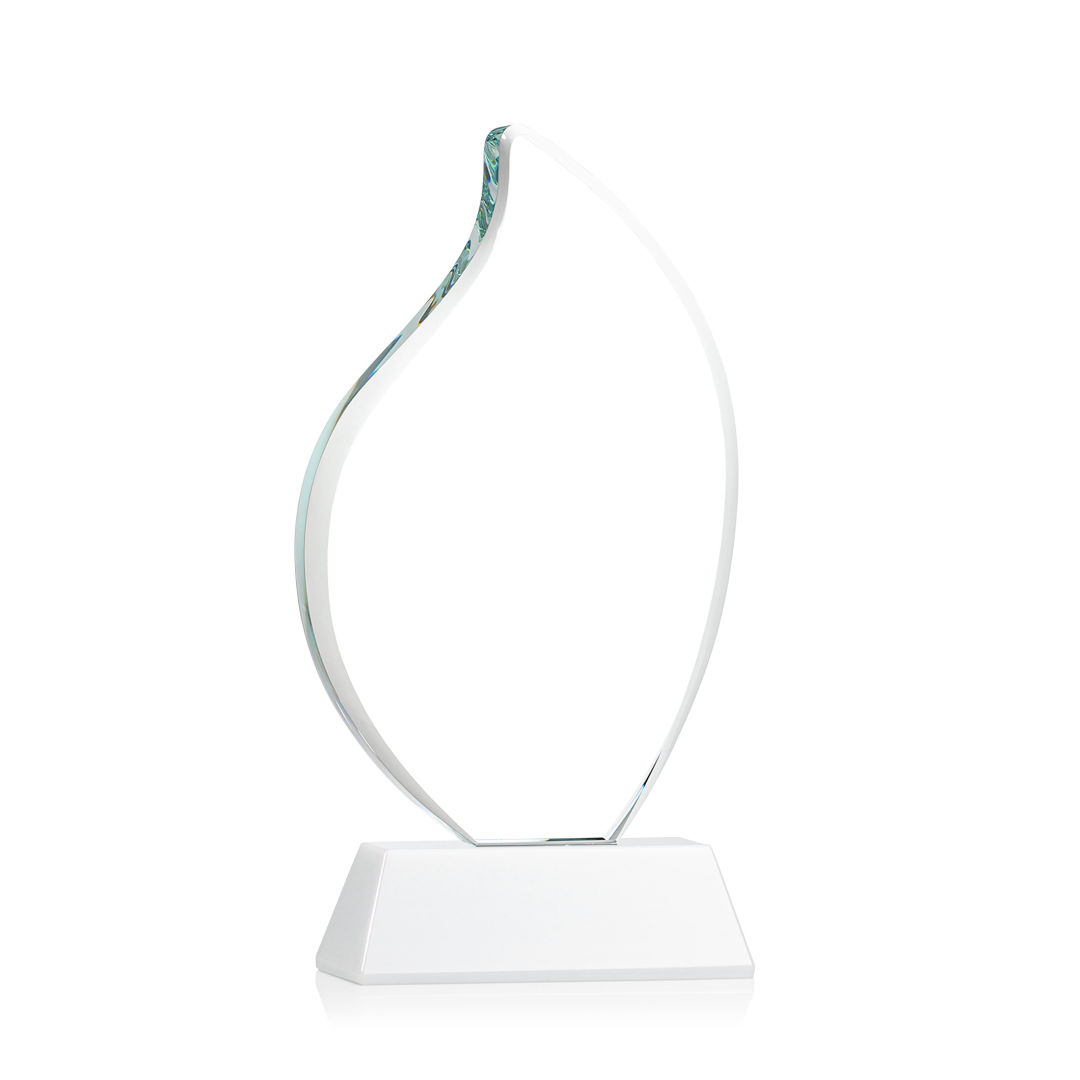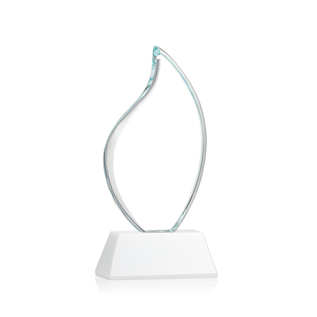 This classic award features a 3/4″ thick Starfire Crystal Flame with rounded edges and mounted on your choice of clear or colored tall tapered Optical Crystal Newhaven Base. An elegant award to recognize a great achievement or momentous event. Packaged in a black satin-lined presentation gift box. Second position etch and colorfill optional. 4.0″ W x 8.125″ H x 2.0″ D