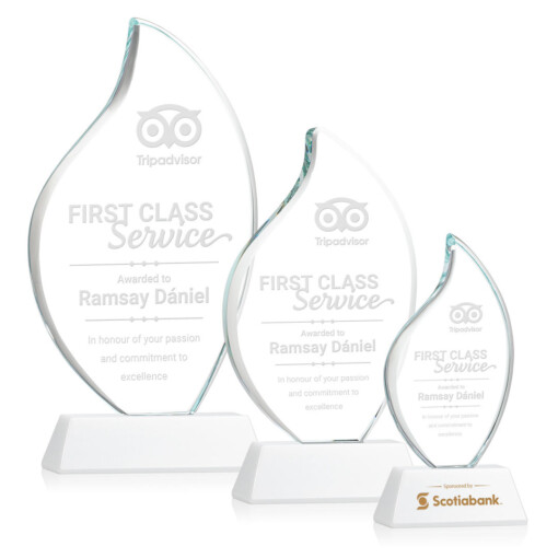 This classic award features a 3/4″ thick Starfire Crystal Flame with rounded edges and mounted on your choice of clear or colored tall tapered Optical Crystal Newhaven Base. An elegant award to recognize a great achievement or momentous event. Packaged in a black satin-lined presentation gift box. Second position etch and colorfill optional. 4.0″ W x 8.125″ H x 2.0″ D
