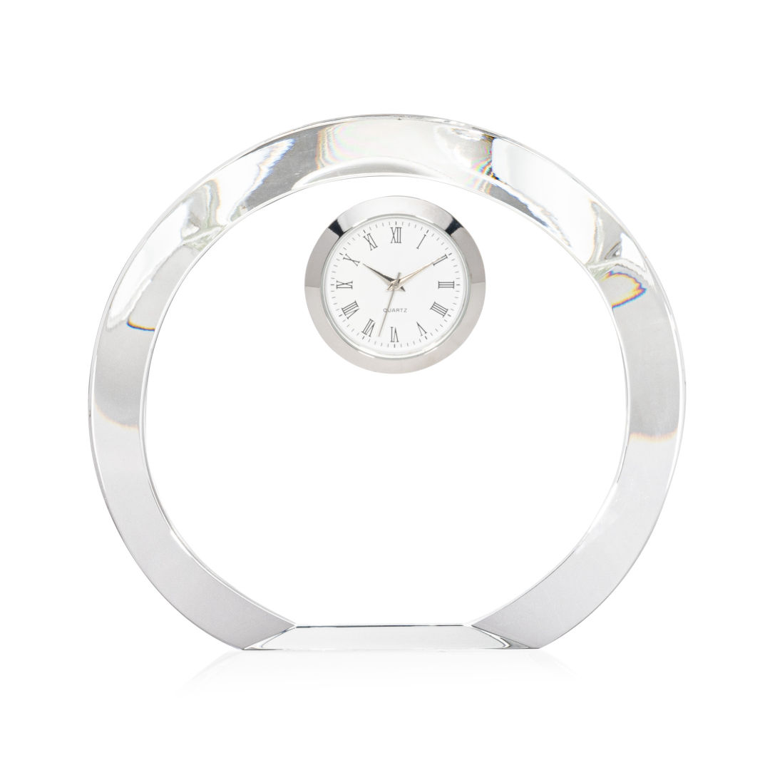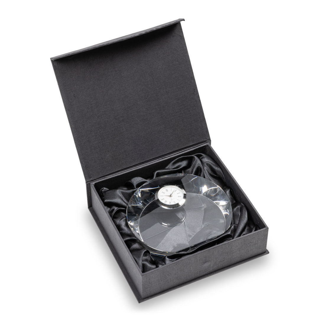 The Oslo VividPrint™ Clock is an exquisite timepiece is crafted from premium optical crystal, meticulously designed to enhance your workspace with sophistication and functionality. Featuring a round shape and flat bottom, the flawless surface reflects light, creating a stunning centerpiece for your desk. Let your message POP! with full-color VividPrint™. 4.75″ W x 4.5″ H x 1.125″ D