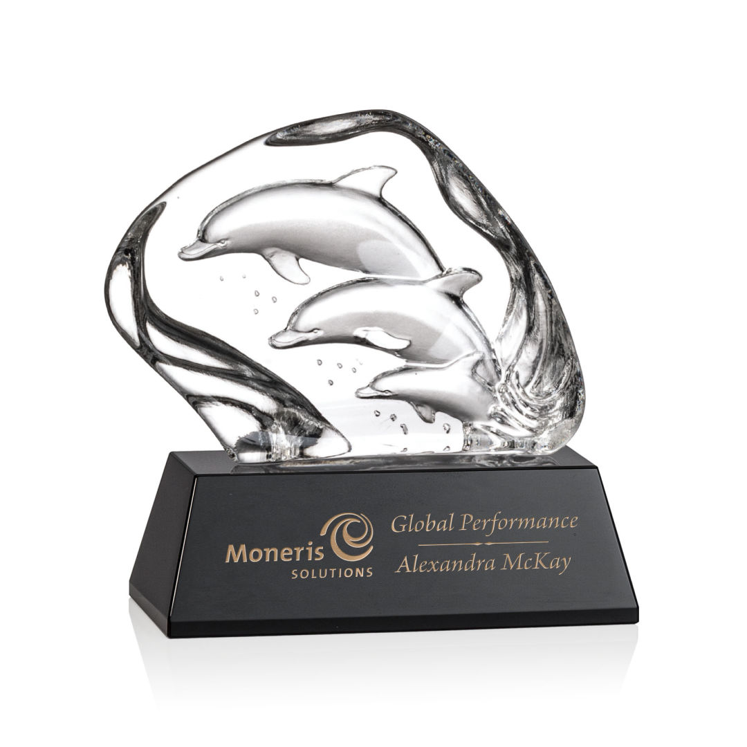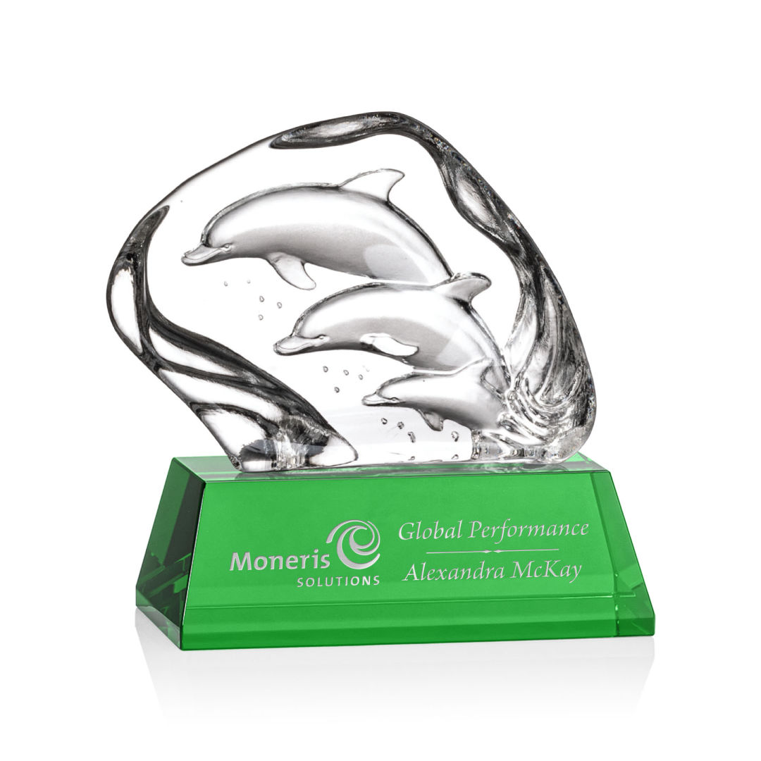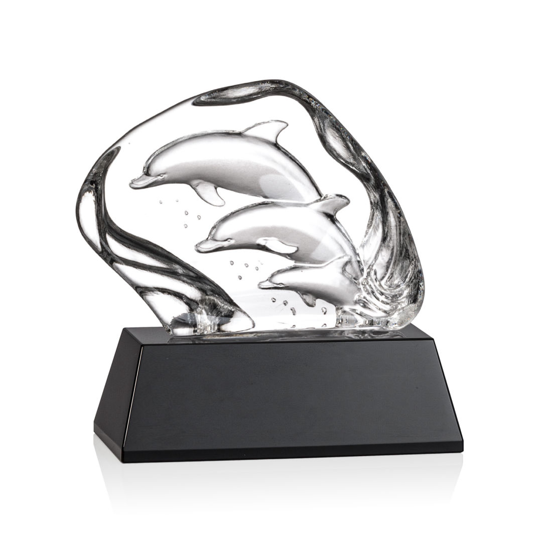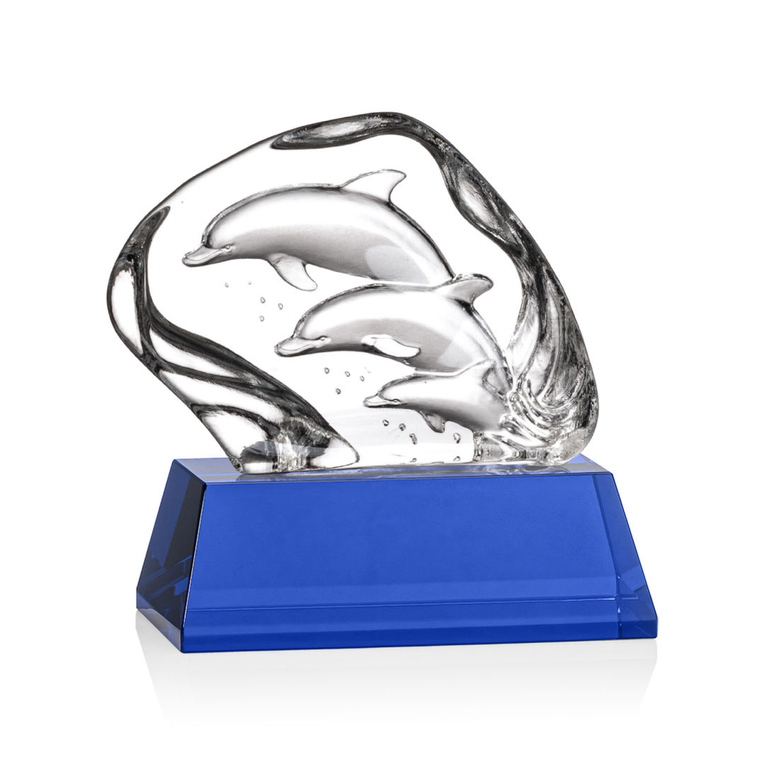 Elegant Optical Crystal Iceberg featuring a beautiful 3-dimenisonal molded family of dolphins. Mounted on a large 2″ Optical Base in your choice of 8 distinct colors. Other figures available. One colorfill included on colored bases. 6.25″ H