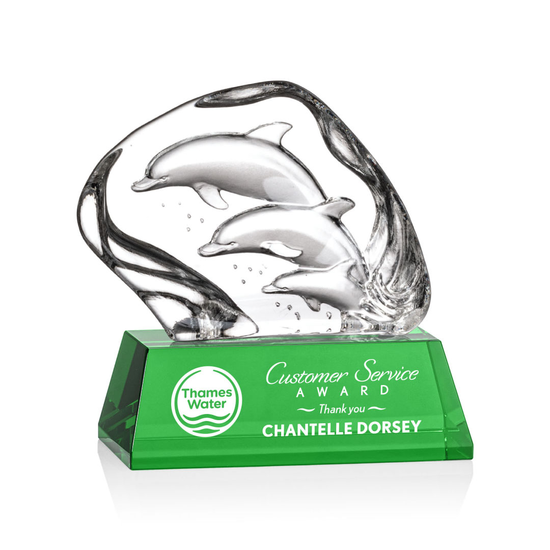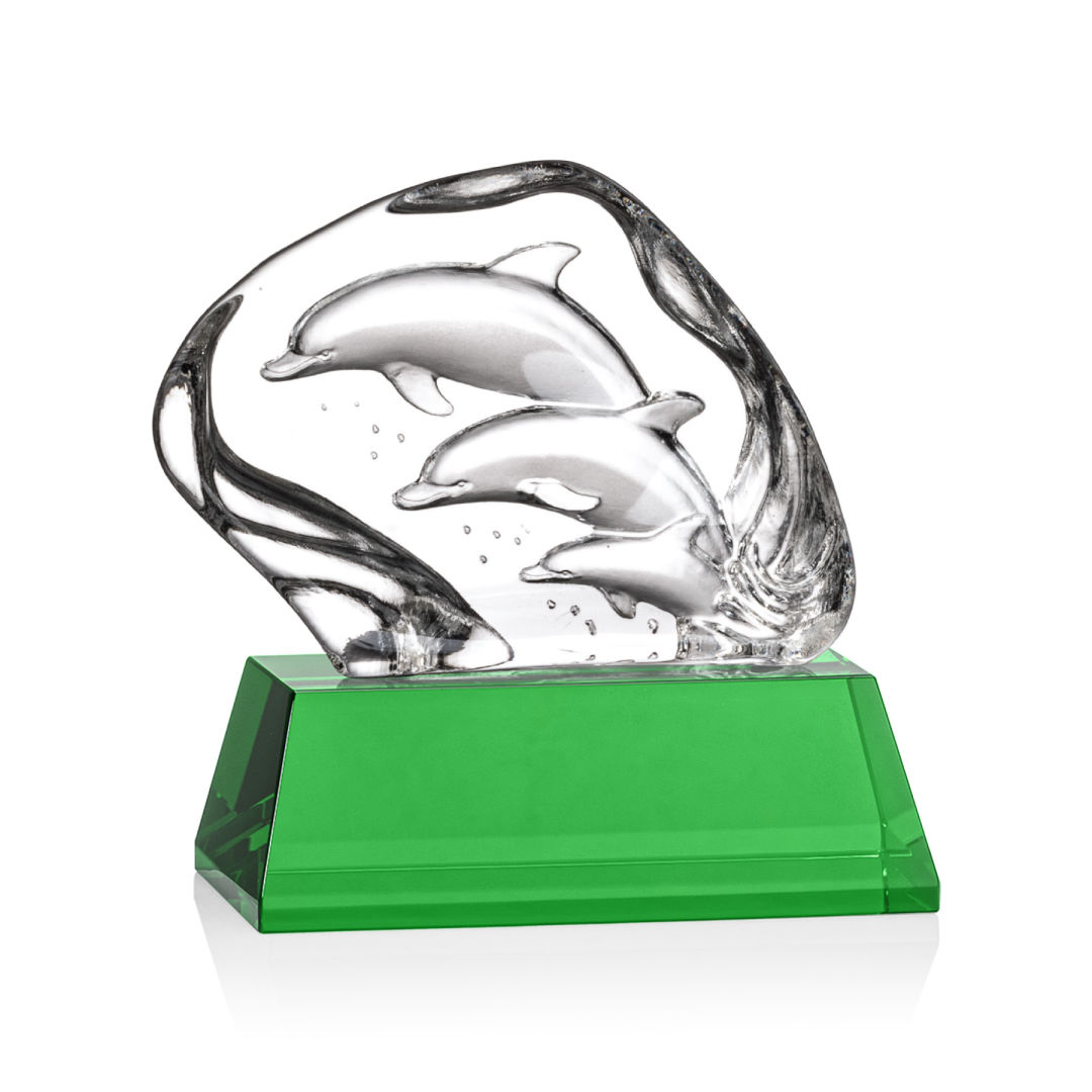 Elegant Optical Crystal Iceberg featuring a beautiful 3-dimenisonal molded family of dolphins. Mounted on a large 2″ Optical Base in your choice of 8 distinct colors. Other figures available. 6.25″ H