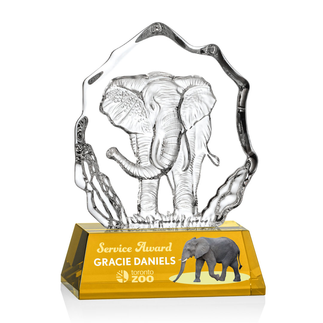 Magnificent Optical Crystal Iceberg featuring a impressive 3-dimensional molded Elephant. A beautiful award to recognize a bold and angelic triumph. Mounted on a large 2″ Optical Base in your choice of 8 distinct colors. Other figures available. 8.5″ H