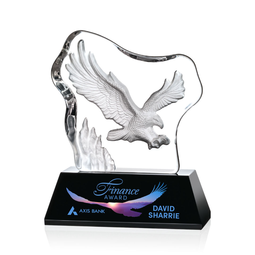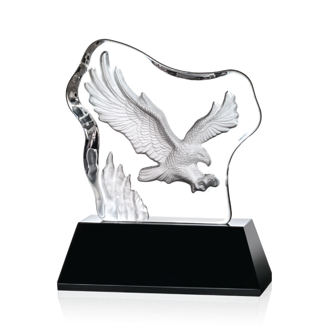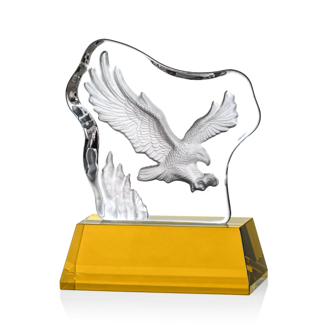 Spectacular Soaring Eagle molded into an Optical Crystal Iceberg and mounted onto a 2″ thick and tapered Optical Base in 8 distinct colors. Other Eagle figures and animals Icebergs available. 7.75″ H