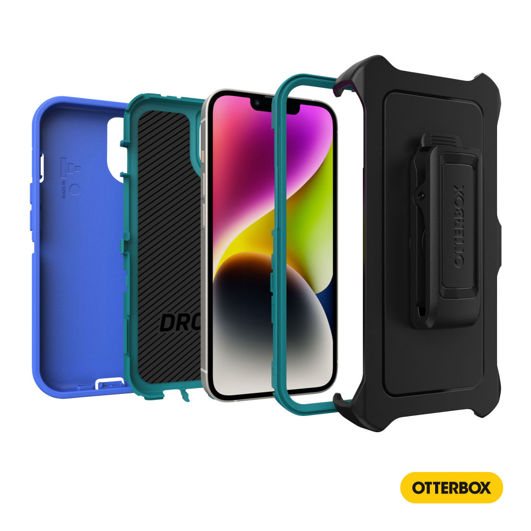 Legendary durable iPhone 14 case, Defender Series, with a multi-layer construction guards your device against serious drops, dirt, scrapes, and bumps. Wireless ready, it works with both Qi charging and MagSafe (no magnets in case). Plus, the included holster does double duty as a belt clip or hands-free kickstand.Features:- Rugged, multi-layer design with port covers- Outlasts heavy use and wear and tear- Holster clips to bags and packs / Kickstand for hands-free viewing- Works with wireless and MagSafe charging pads (no magnets in case)- Fully compatible with 5G networks- Made with more than 50% recycled plasticProduct Size: 3.51″ W x 6.33″ H x 1.25″ D. 3.51″ W x 6.33″ H x 1.25″ D