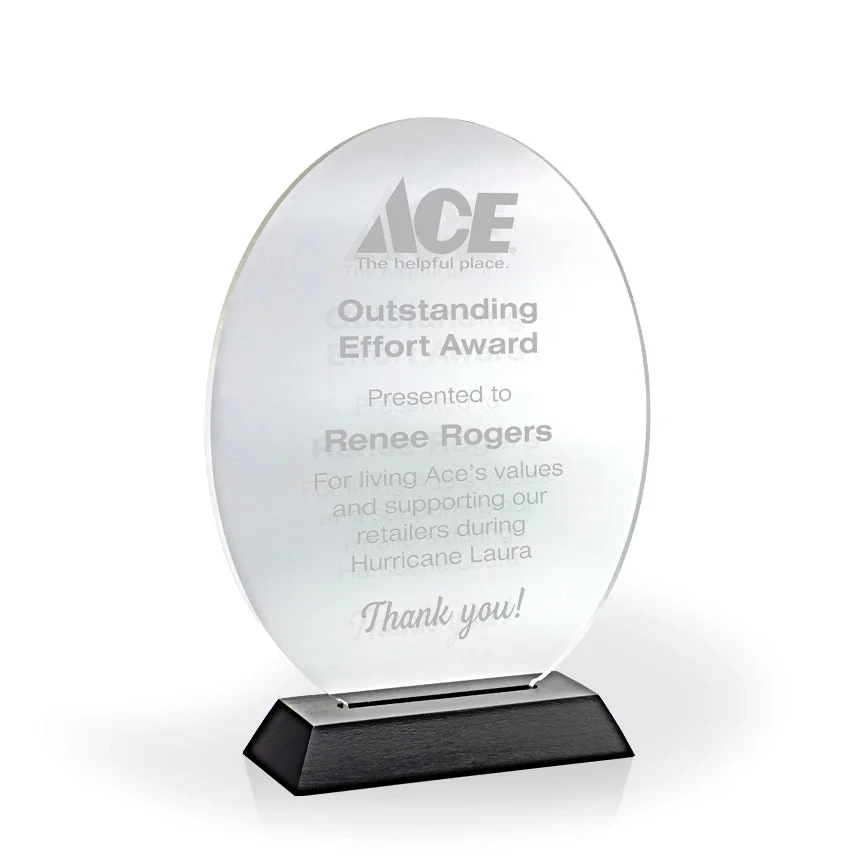 An attractive and affordable award option, our acrylic cutout awards are made in the USA with 1/4″ clear acrylic and a black, beveled wood base. These budget-friendly awards require minor assembly. The acrylic pop-in and wood base are packaged together, un-attached, in a slim-line white tri-fold box. 7.75″ H x 6″ W x 2″ D