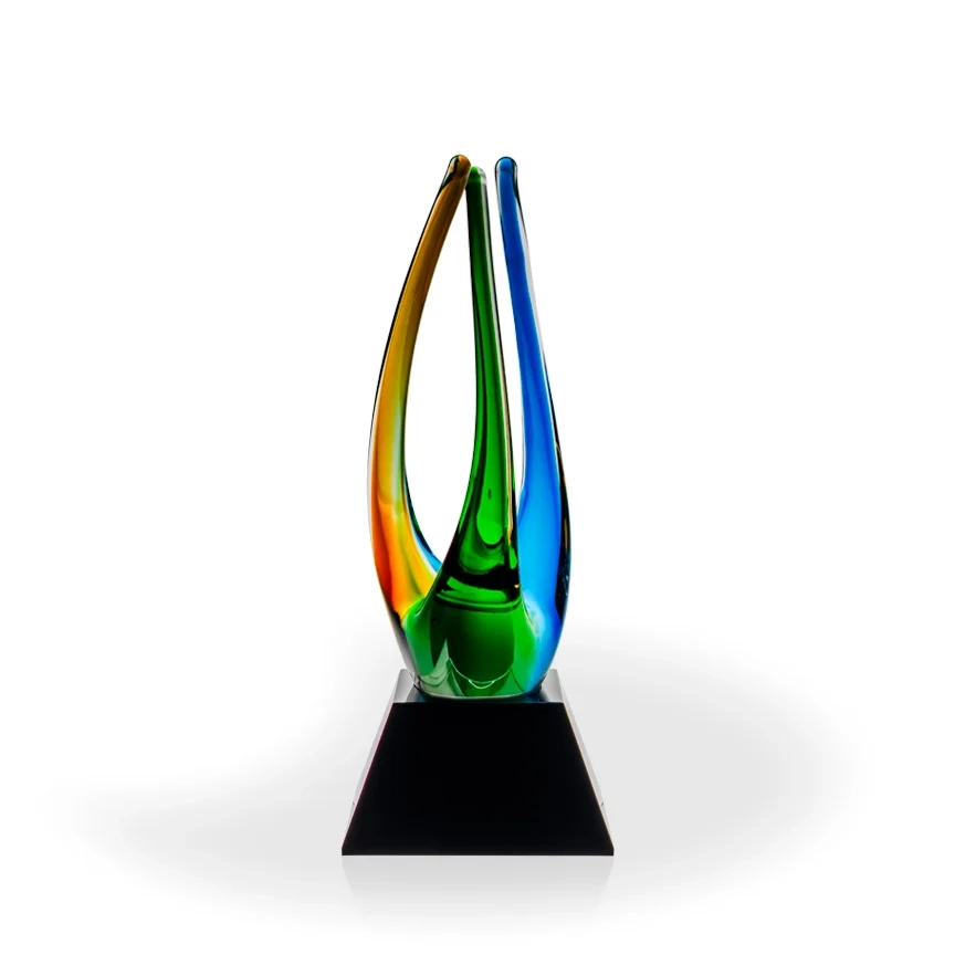 The Owen Art Glass Award is three distinctive colors formed to create a tripod. Its shape symbolizes a team working together, or three elements becoming one. The engraving on the front of the base will be silver filled for readability. Art glass awards are hand blown, and each piece will be slightly different in color, shape, and size. Bubbles and swirls are a part of the process and are considered normal and acceptable. 12.5″ H x 4.5″ W x 4.5″ D