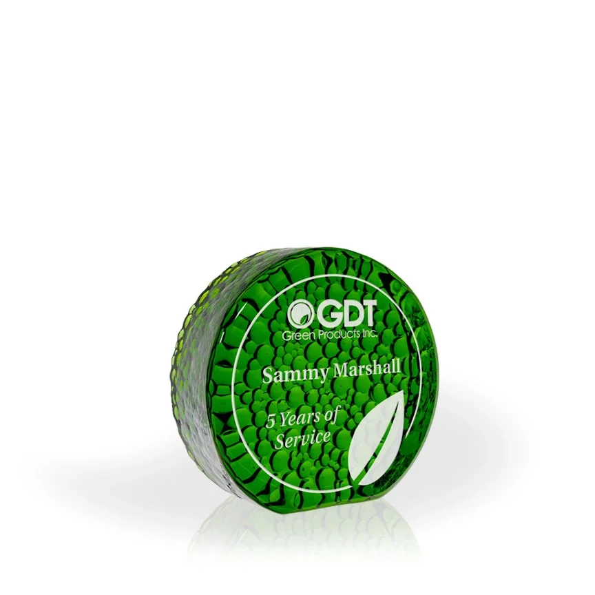 The Oz Raindrop Recycled Glass Award is a stunning eco-friendly award option. This award series is made in the USA from 100% recycled glass material. The free-standing round shape allows plenty of space for etching your logo and text, and is color filled with silver for visibility. Recycled glass awards are hand made, and each piece can be slightly different in color, shape and size. Bubbles and swirls are a part of the process and are considered normal and acceptable. 3 1/2″ H x 3 3/4″ W x 1″ Thick