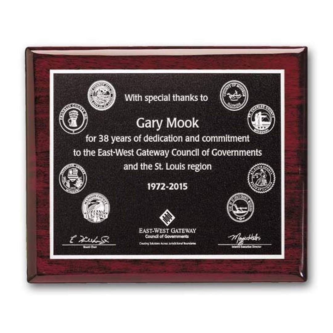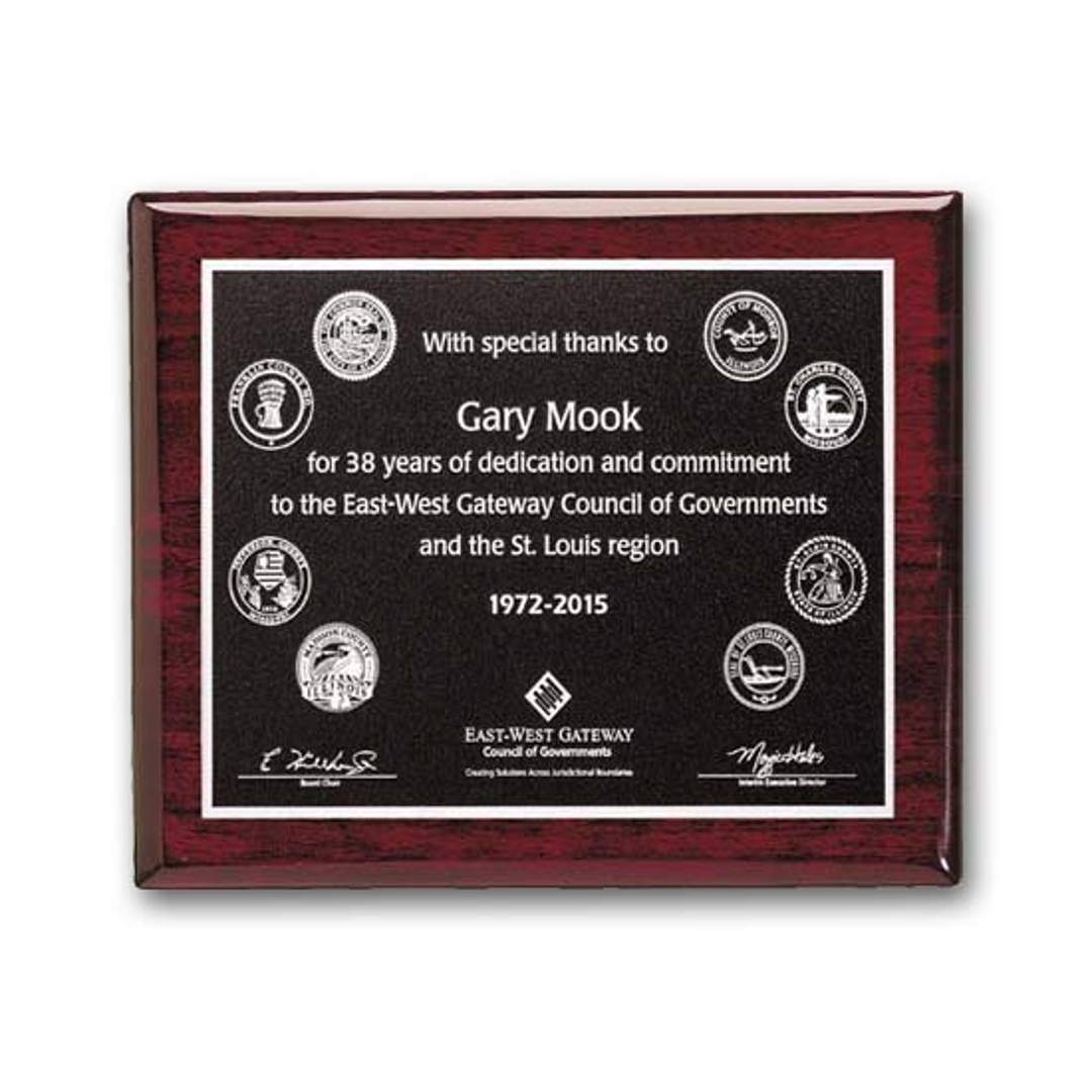The rich Photocast relief process features a recessed, textured background (black or brown) with raised smooth silver designs on an etched plate mounted to our rosewood piano finished wood plaque. 7.0″ W x 9.0″ H