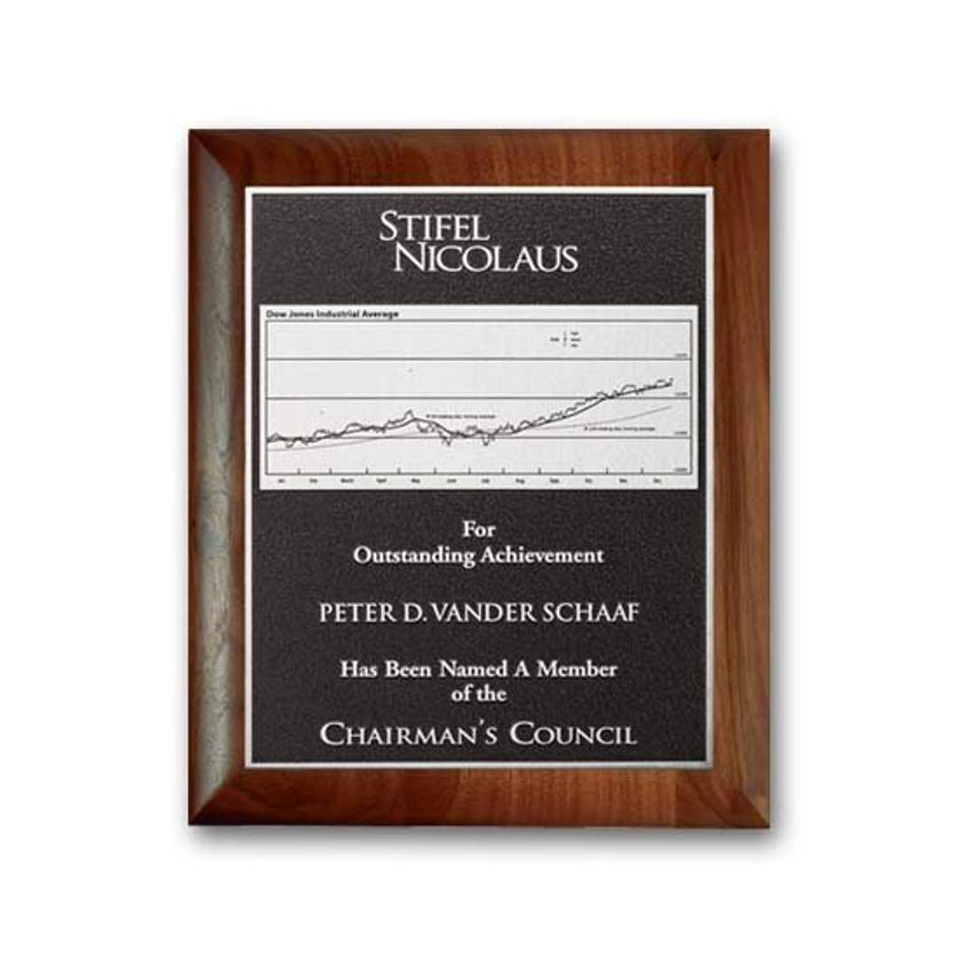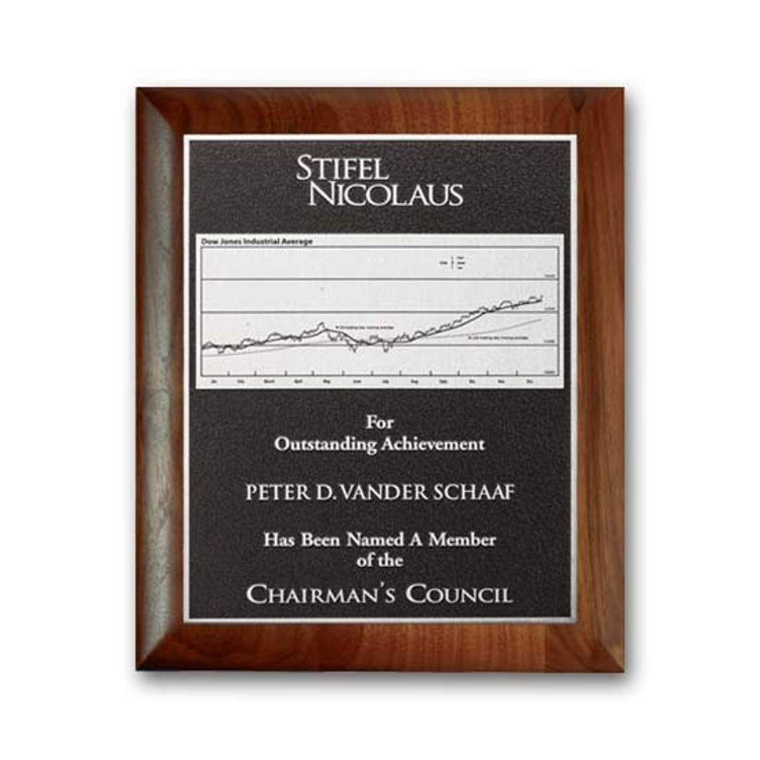 The rich Photocast relief process features a recessed, textured background (black or brown) with raised smooth silver designs on an etched plate mounted to our walnut plaque with rolled edges. 7.0″ W x 9.0″ H