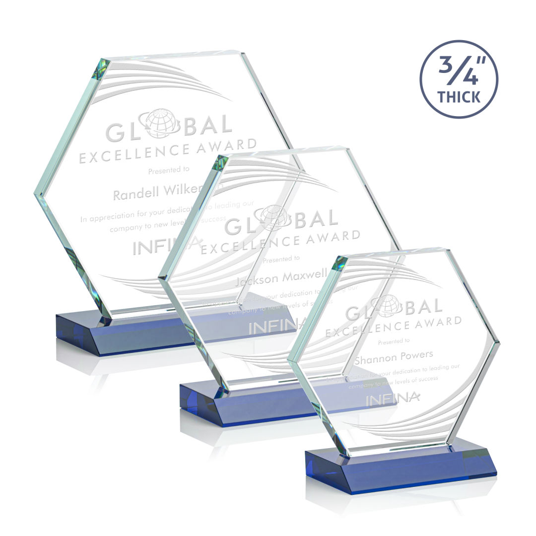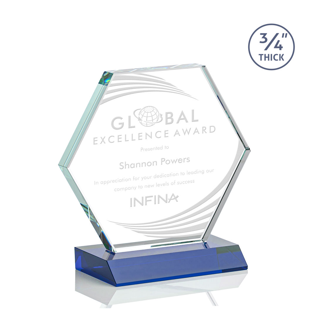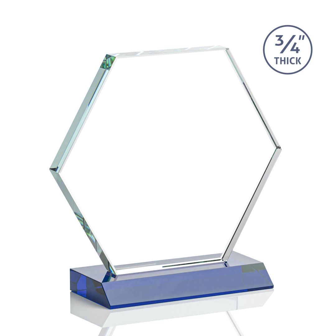 The Pickering Starfire Crystal Award features a brilliant 0.75″ thick hexagon mounted on a blue crystal base to display your remarkable achievement proudly and prominently. 7.0″ W x 6.75″ H x 3.0″ D