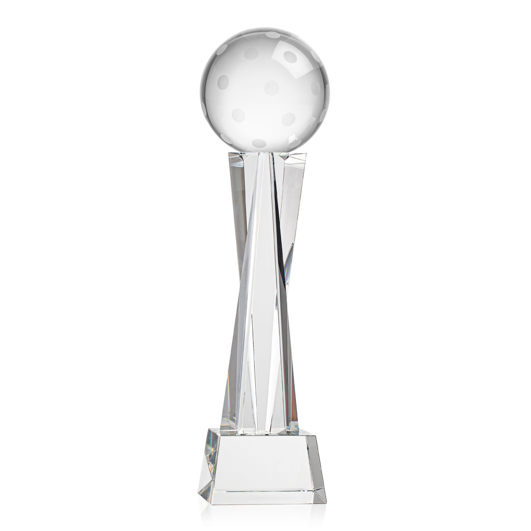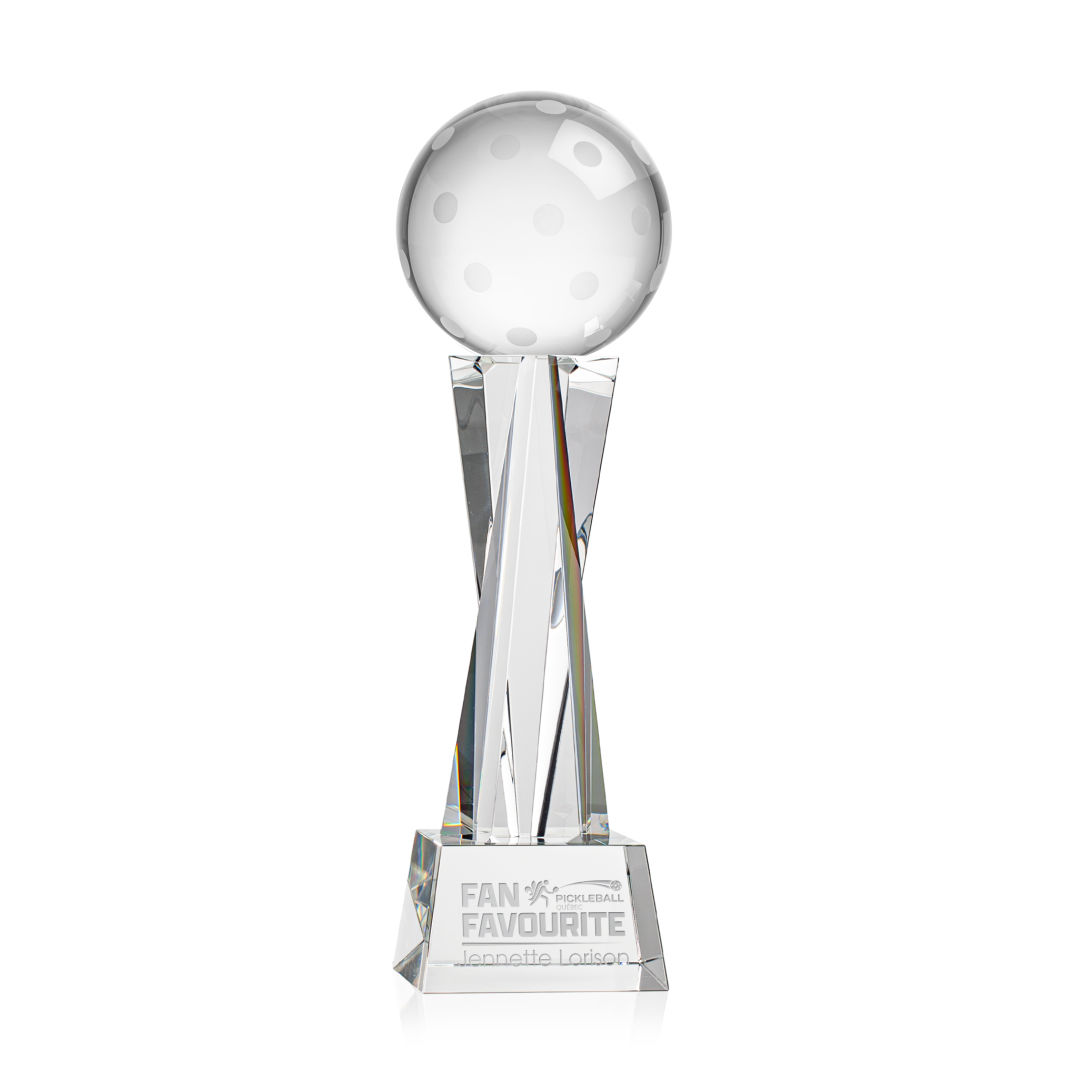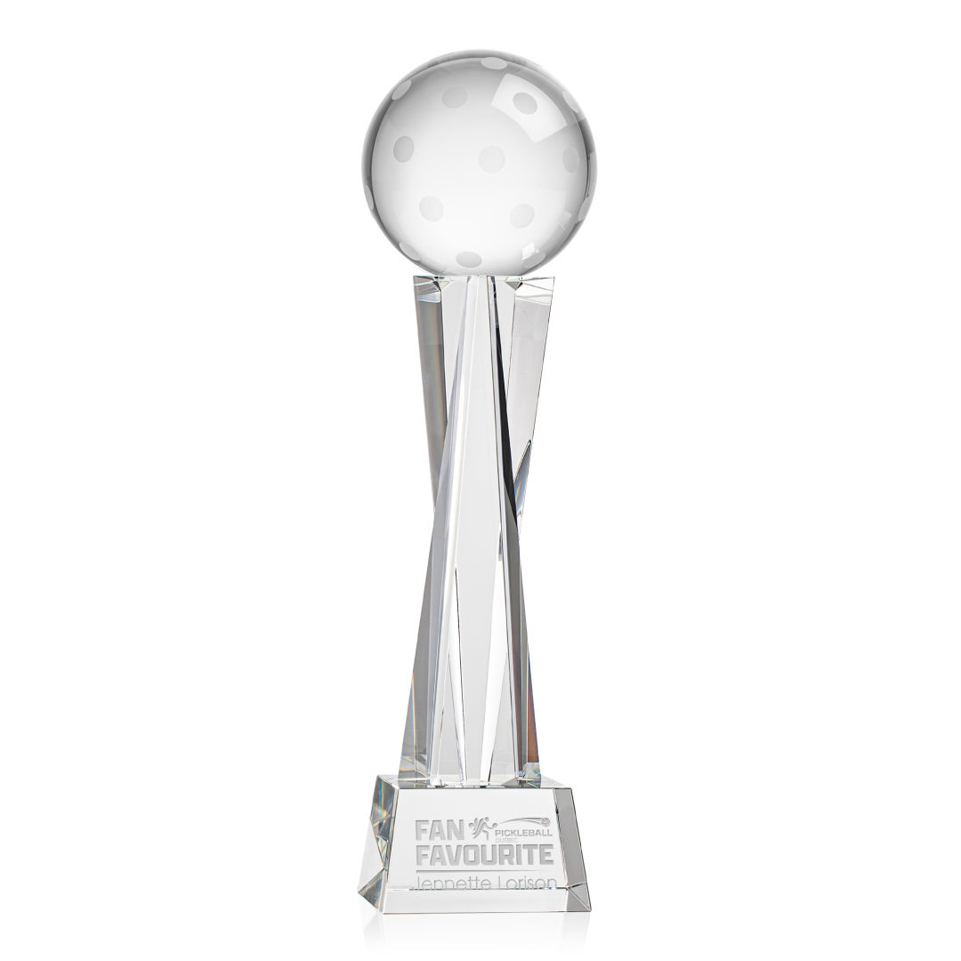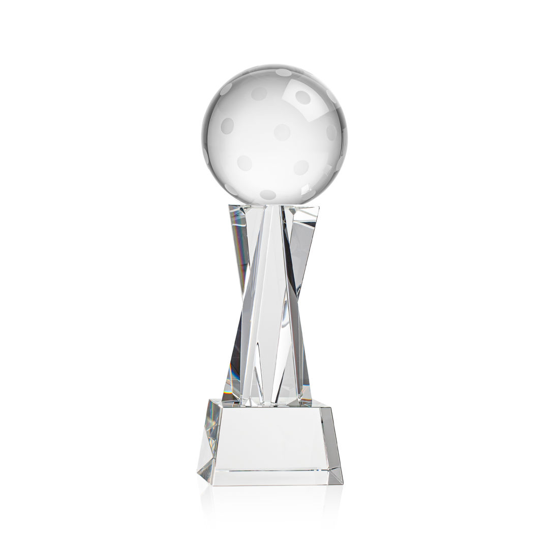 Our Pickleball Award is a tribute to the athleticism and dedication of pickleball enthusiasts. At the heart of this masterpiece is a flawlessly rendered Optical Crystal Pickleball that captures and refracts light in a captivating display. Mounted on a complimenting Optical base for personalization with a Logo or Name. An outstanding award, gift, or keepsake for pickleball tournaments, competitions, or special occasions. 4.0″ W x 10.875″ H x 4.0″ D