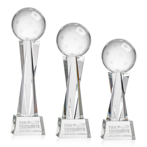 Our Pickleball Award is a tribute to the athleticism and dedication of pickleball enthusiasts. At the heart of this masterpiece is a flawlessly rendered Optical Crystal Pickleball that captures and refracts light in a captivating display. Mounted on a complimenting Optical base for personalization with a Logo or Name. An outstanding award, gift, or keepsake for pickleball tournaments, competitions, or special occasions. 4.0″ W x 10.875″ H x 4.0″ D