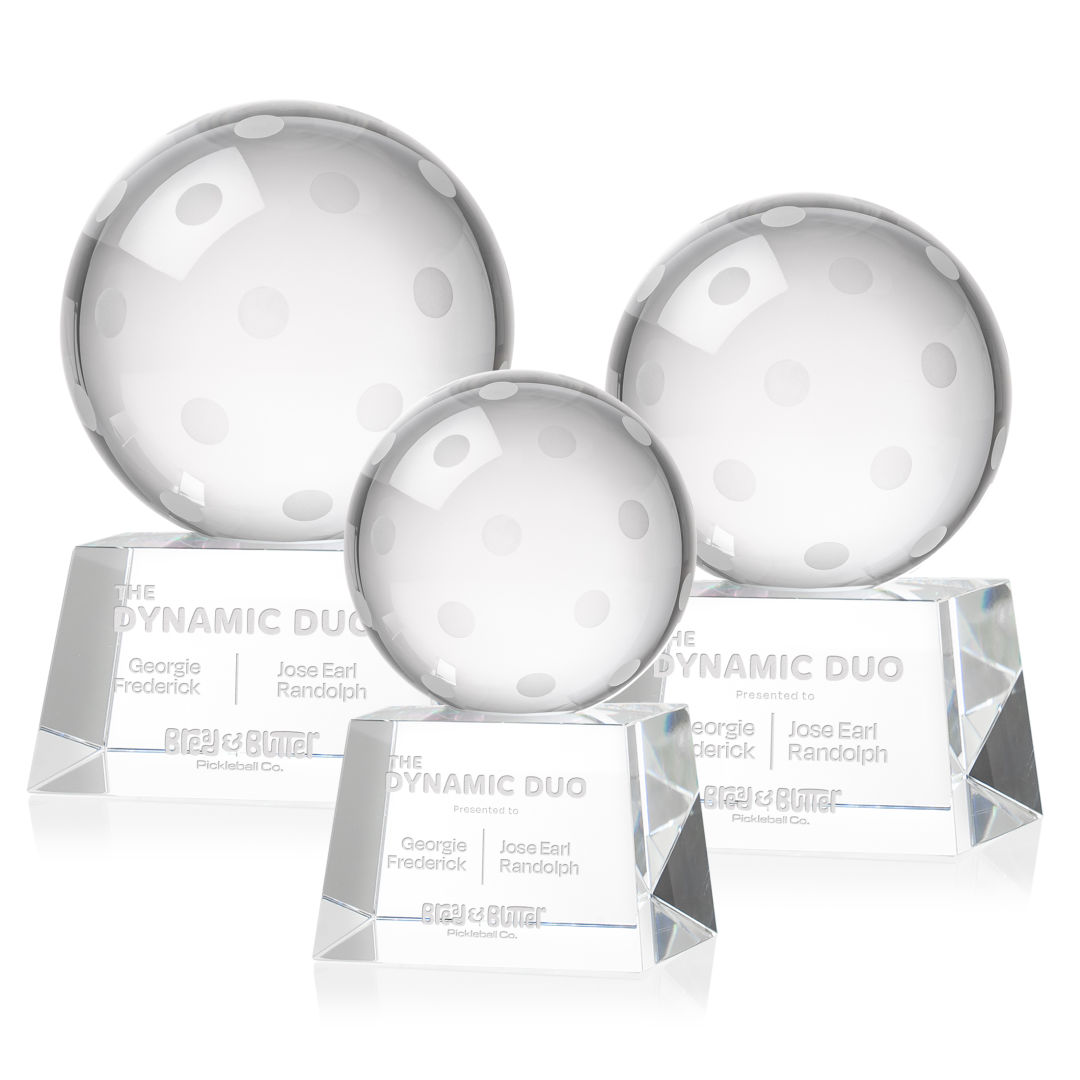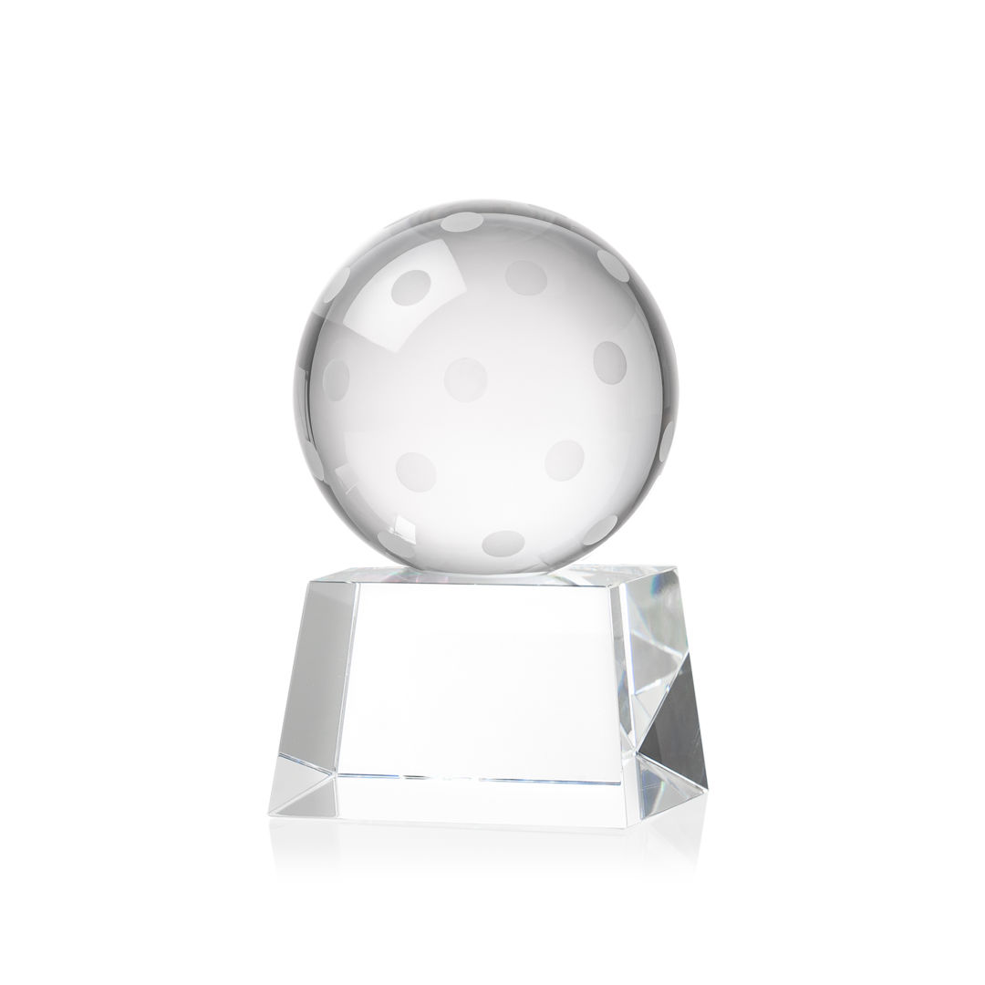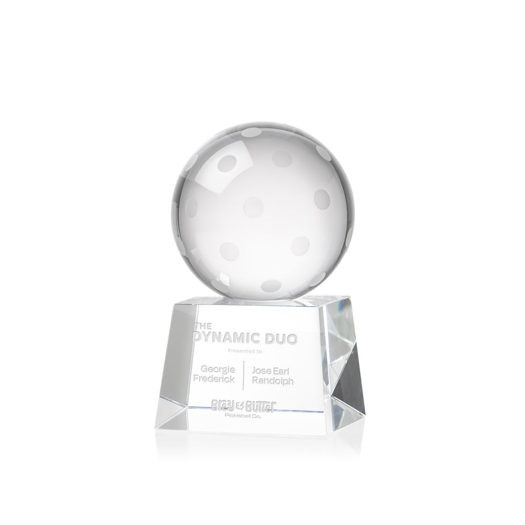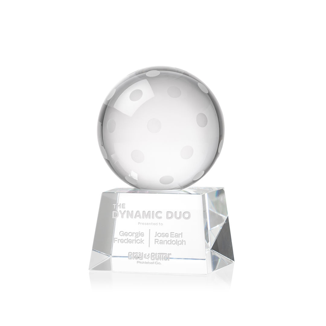 Our Pickleball Award is a tribute to the athleticism and dedication of pickleball enthusiasts. At the heart of this masterpiece is a flawlessly rendered Optical Crystal Pickleball that captures and refracts light in a captivating display. Mounted on a complimenting Optical base for personalization with a Logo or Name. An outstanding award, gift, or keepsake for pickleball tournaments, competitions, or special occasions. 2.5″ W x 4.25″ H x 2.5″ D
