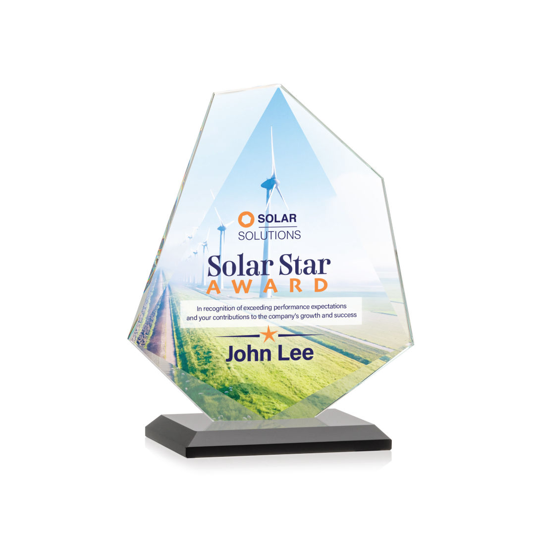 The Starfire Crystal Picton VividPrint™ Award embodies true elegance with its tapered beveled edges. This Stunning Budget Busting Award is mounted on a beveled base and is perfect for employee appreciation in any business sector! Let your message POP with full-color VividPrint™! Other styles are available. Packaged in a black satin-lined gift box. Available in your choice of 8 distinct colored bases. 5.5″ W x 6.75″ H x 3.0″ D