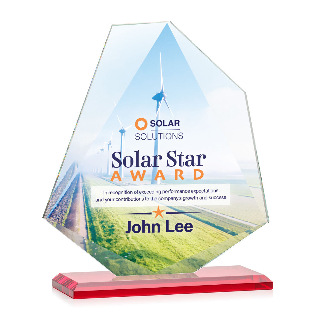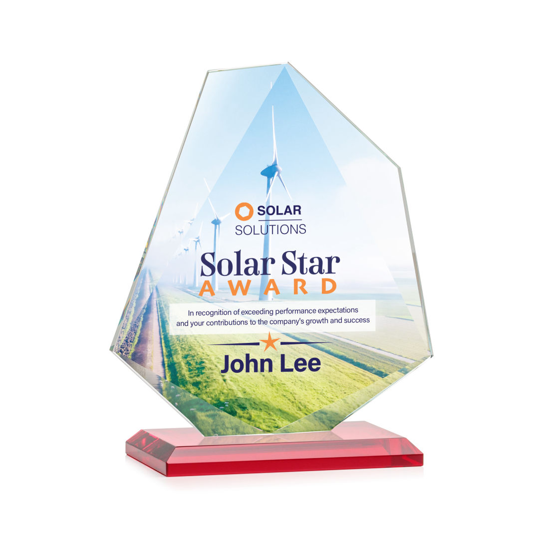 The Starfire Crystal Picton VividPrint™ Award embodies true elegance with its tapered beveled edges. This Stunning Budget Busting Award is mounted on a beveled base and is perfect for employee appreciation in any business sector! Let your message POP with full-color VividPrint™! Other styles are available. Packaged in a black satin-lined gift box. Available in your choice of 8 distinct colored bases. 5.5″ W x 6.75″ H x 3.0″ D