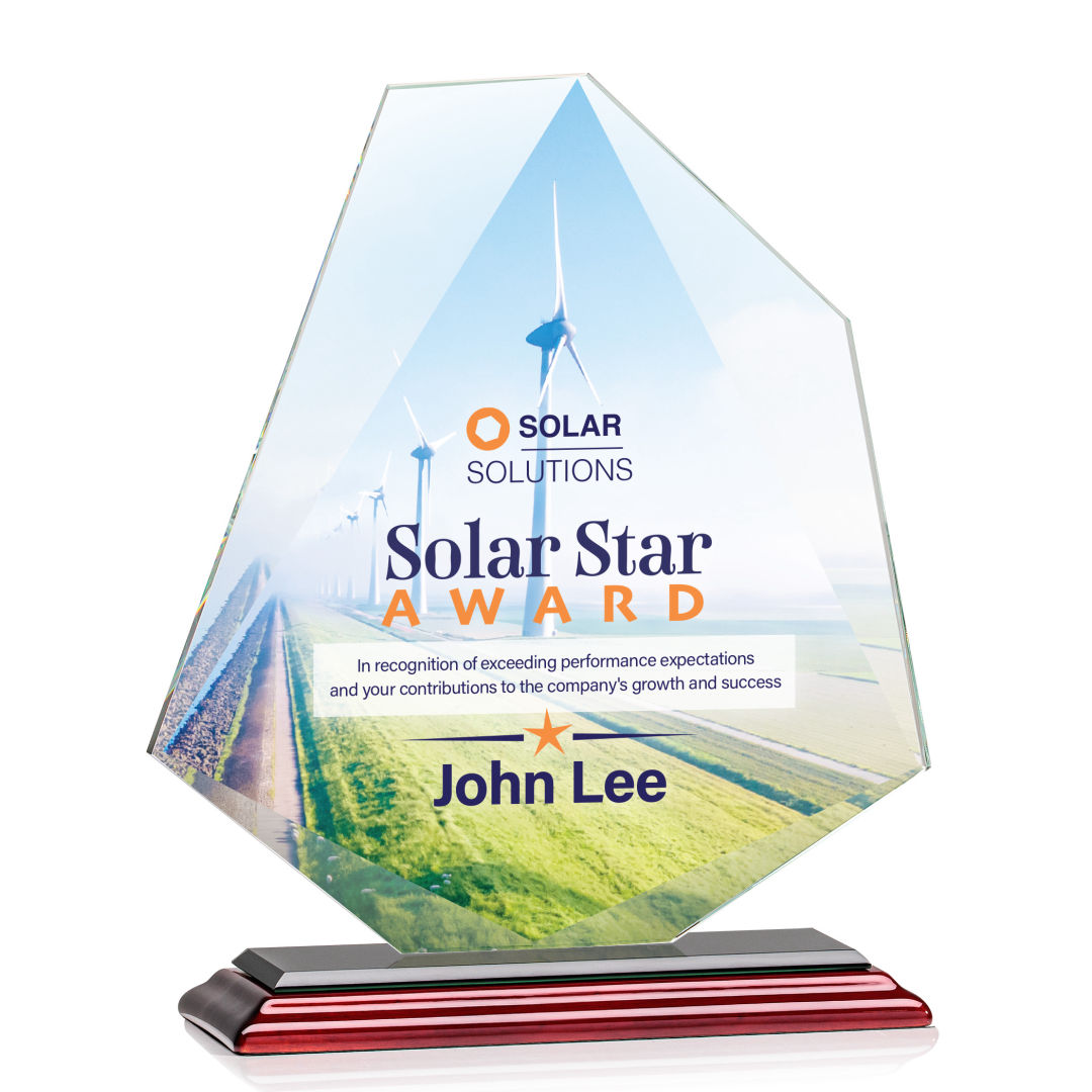 The Starfire Crystal Picton VividPrint™ Award embodies true elegance with its tapered beveled edges. This Stunning Budget Busting Award is mounted on a beveled base and is perfect for employee appreciation in any business sector! Let your message POP with full-color VividPrint™! Other styles are available. Packaged in a black satin-lined gift box. Available in your choice of 8 distinct colored bases. 5.5″ W x 6.75″ H x 3.0″ D