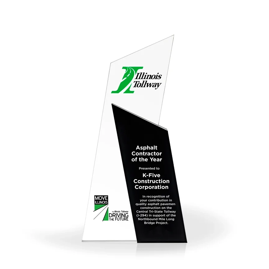 The Pisa Incline Acrylic Award is the perfect way to recognize outstanding achievements in any setting. This modern and sleek award is custom cut from solid black and clear acrylic and stands 12.5″ tall, making it a bold and impressive display piece. There is plenty of space for adding UV full color printed award information, including logos, other branding, names, and award theme. 12.5″ H x 6.5″ W x 1.25″ D