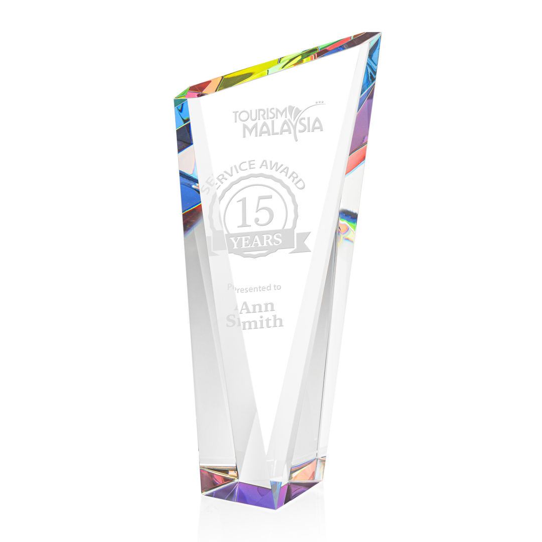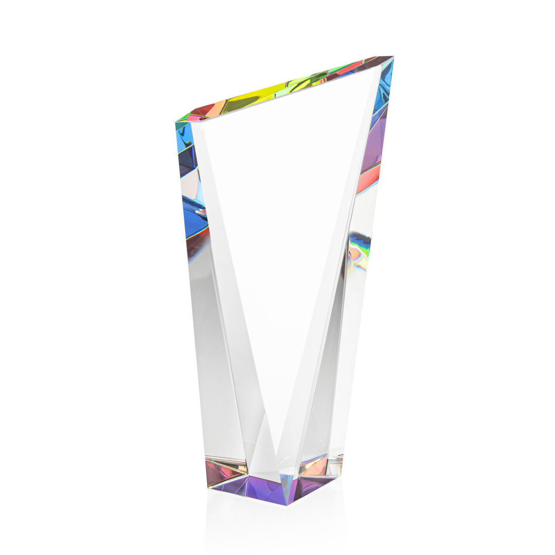 The magnificently angular design of the Plymouth Award features a beautiful, multi-colored base that showcases a dazzling display of multi-color reflections through its slanted top. This freestanding accolade is the presentation piece deserving of an outstanding achiever. 4.125″ W x 7.5″ H x 2.0″ D