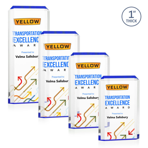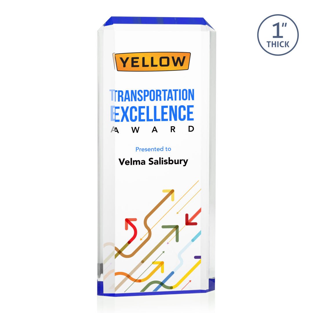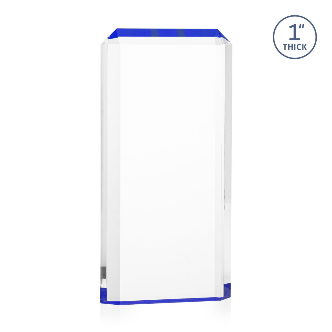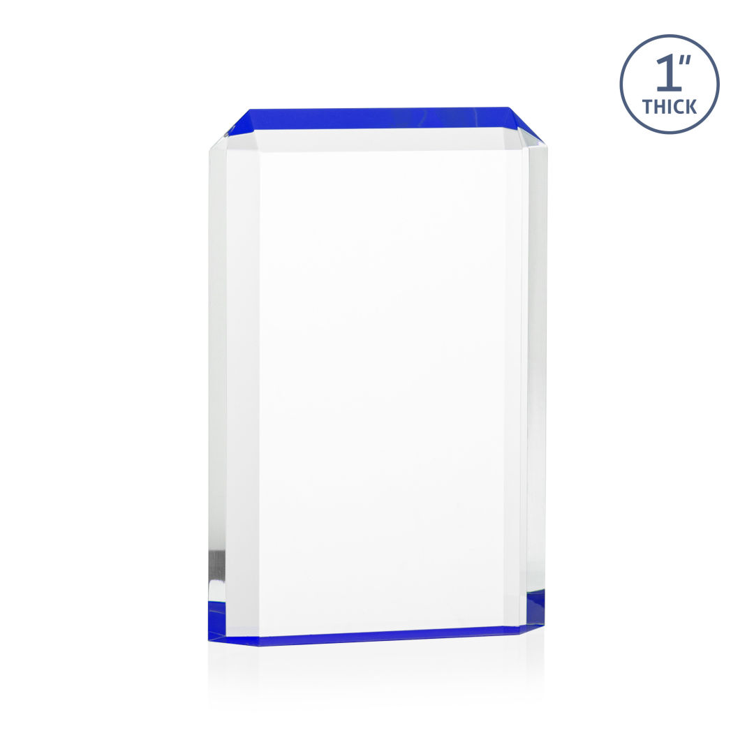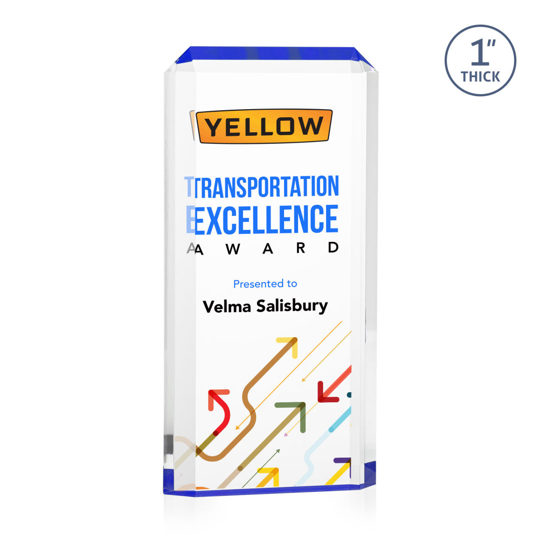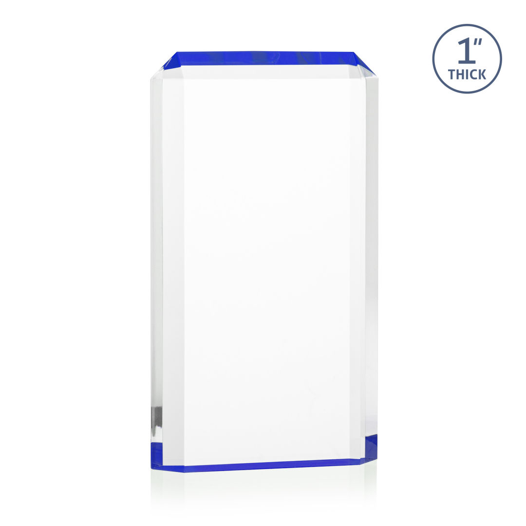 The freestanding acrylic Powell VividPrint™ Award is a striking tribute, featuring a choice of reflective sapphire, gold, or ruby bottoms that beautifully highlight each bevel with vibrant color. This award’s sleek design and brilliant hues make it an eye-catching piece for honoring exceptional achievements. Celebrate excellence with the Powell Award, where elegance meets brilliance. Let your message POP with full color VividPrint™! 4.0″ W x 6.0″ H x 1.0″ D