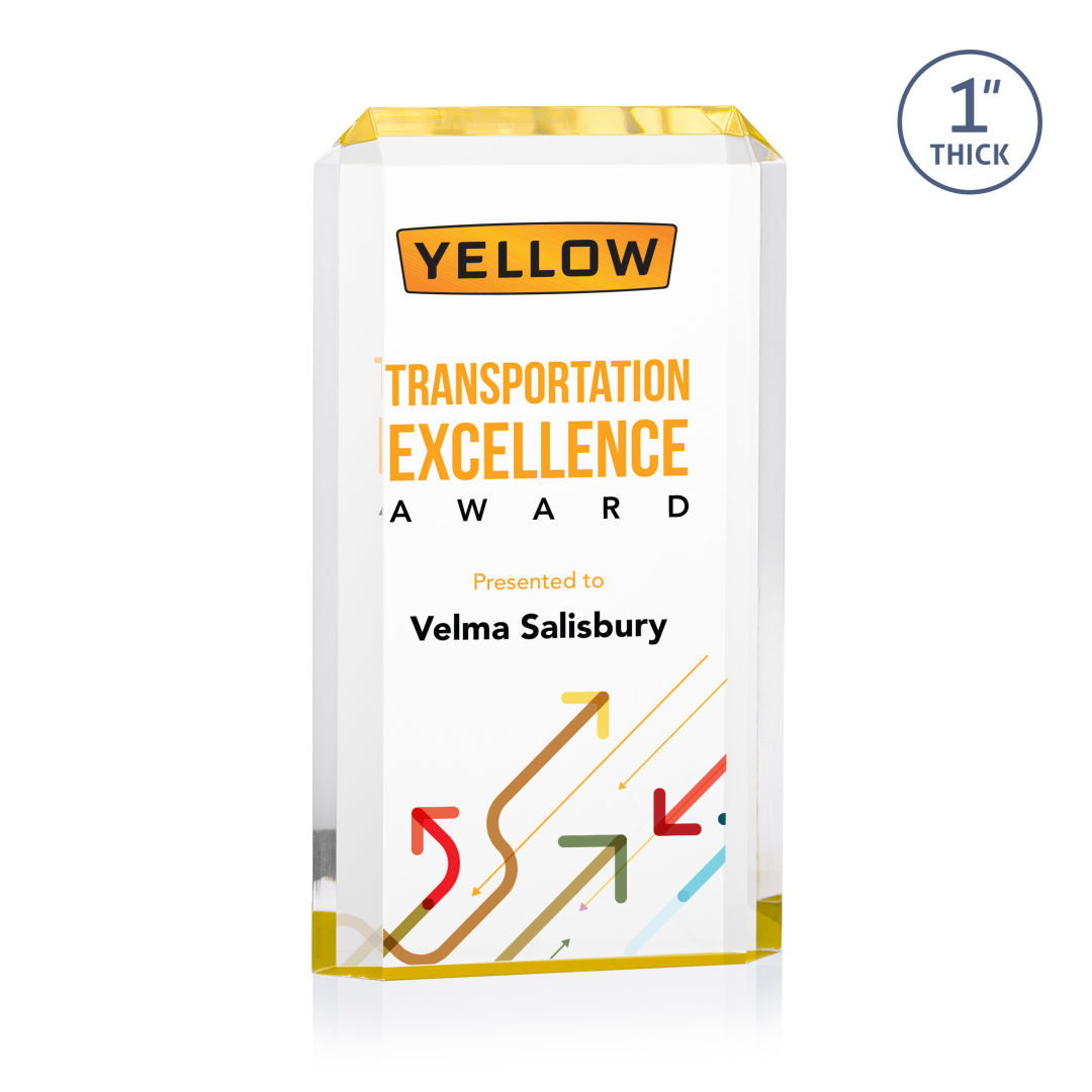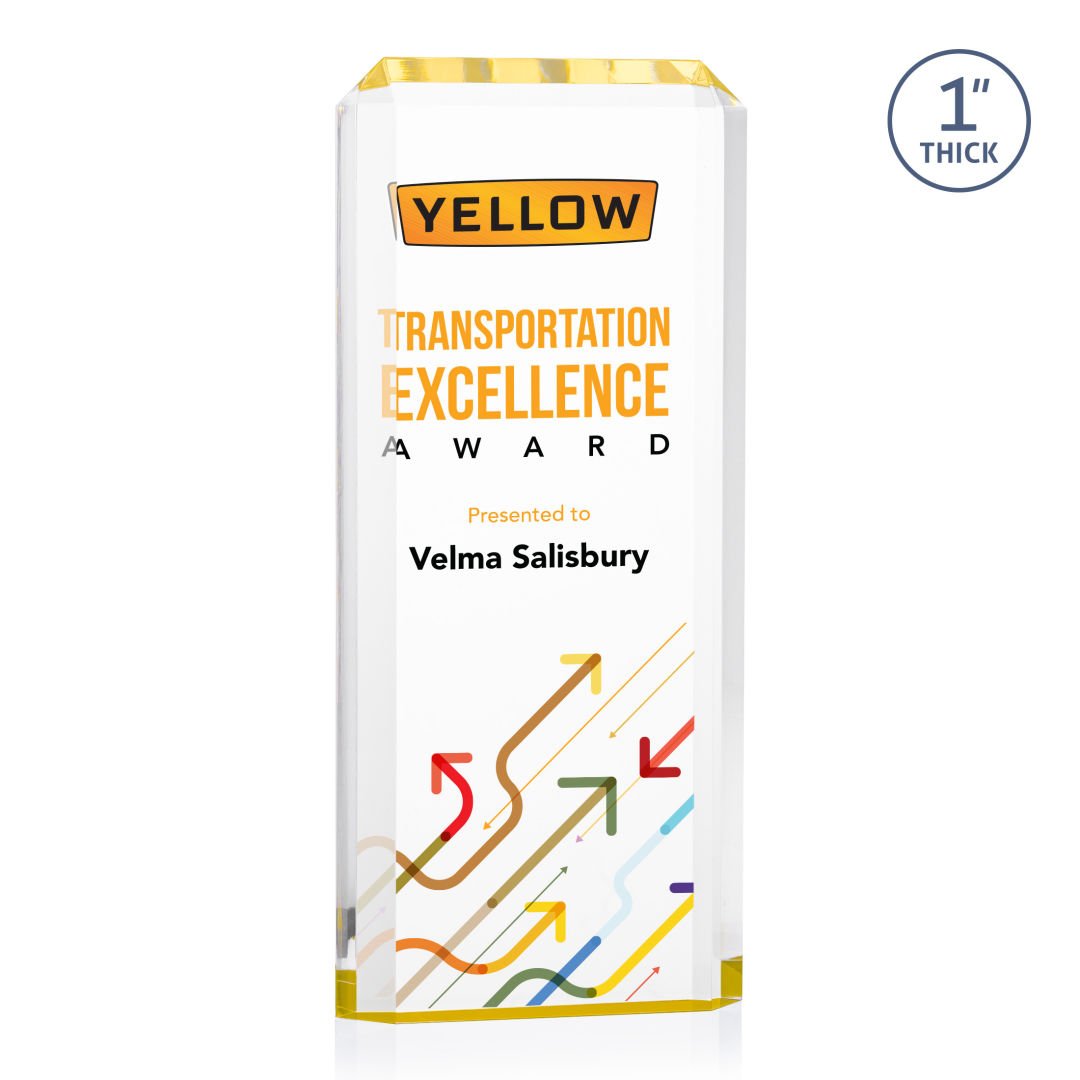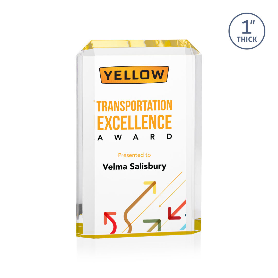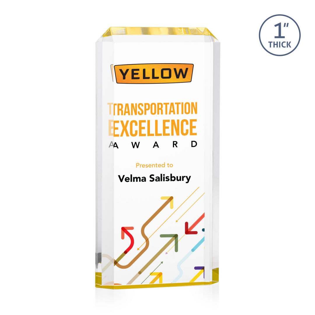 The freestanding acrylic Powell VividPrint™ Award is a striking tribute, featuring a choice of reflective sapphire, gold, or ruby bottoms that beautifully highlight each bevel with vibrant color. This award’s sleek design and brilliant hues make it an eye-catching piece for honoring exceptional achievements. Celebrate excellence with the Powell Award, where elegance meets brilliance. Let your message POP with full color VividPrint™! 4.0″ W x 6.0″ H x 1.0″ D