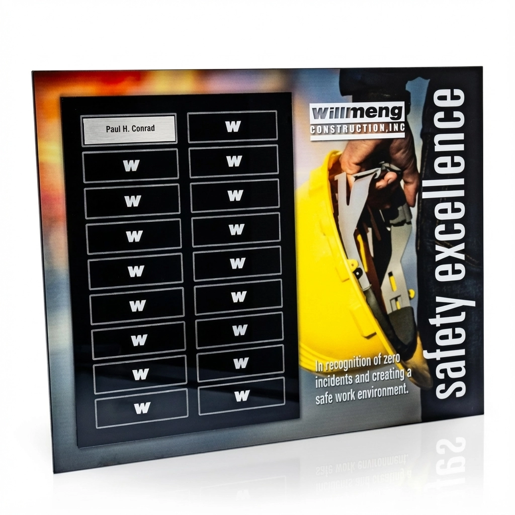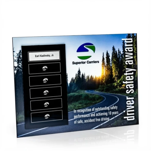 The Radiant Perpetual Award Plaque is an acrylic plaque with a black acrylic plate attached to the front that holds 6 perpetual plates. This is a unique and budget friendly option for every awards program. This plaque is a standard wall size that measures 9″ x 12″. The satin silver metal perpetual plates measure 2.5″ w x 0.5″ h. NOTE: Published price includes decorated plaque, but DOES NOT include the 6 personalized plates. Prepay for all 6 plates at $20.00 (R) each, or pay for plates as needed for $25.00 (R) each. Plate prices include USPS shipping. 9″ H x 12″ W x 0.5″ D