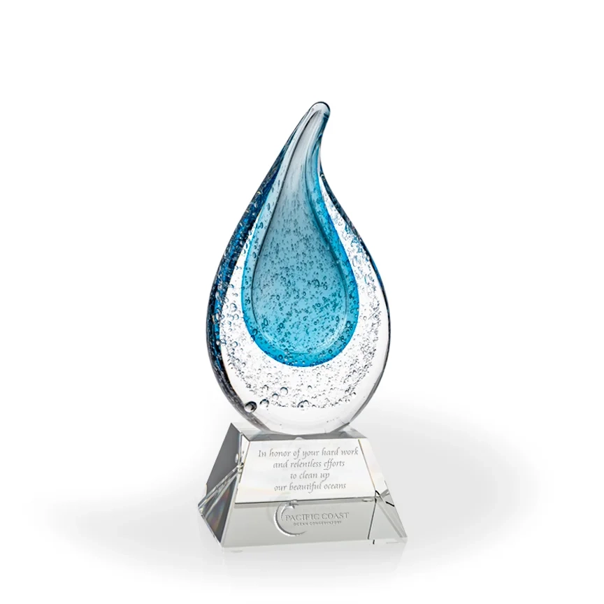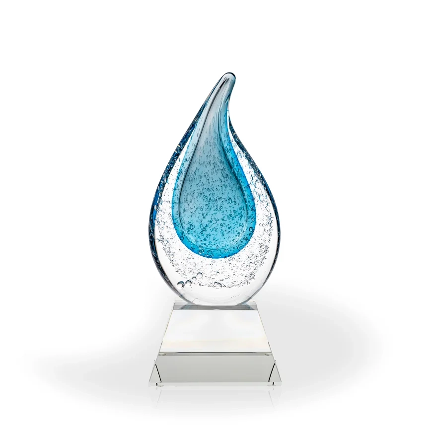 The Rainey Blue Flame Art Glass Award is a stunningly unique award that is sure to draw admiration. This gorgeous piece of art features a vibrant blue and hundreds of bubbles in the shape of a water drop or flame atop a clear crystal base. Art glass awards are hand blown, and each piece will be slightly different in color, shape, and size. Bubbles and swirls are a part of the process and are considered normal and acceptable. 10.5″ H x 4.25″ W x 4.25″ D