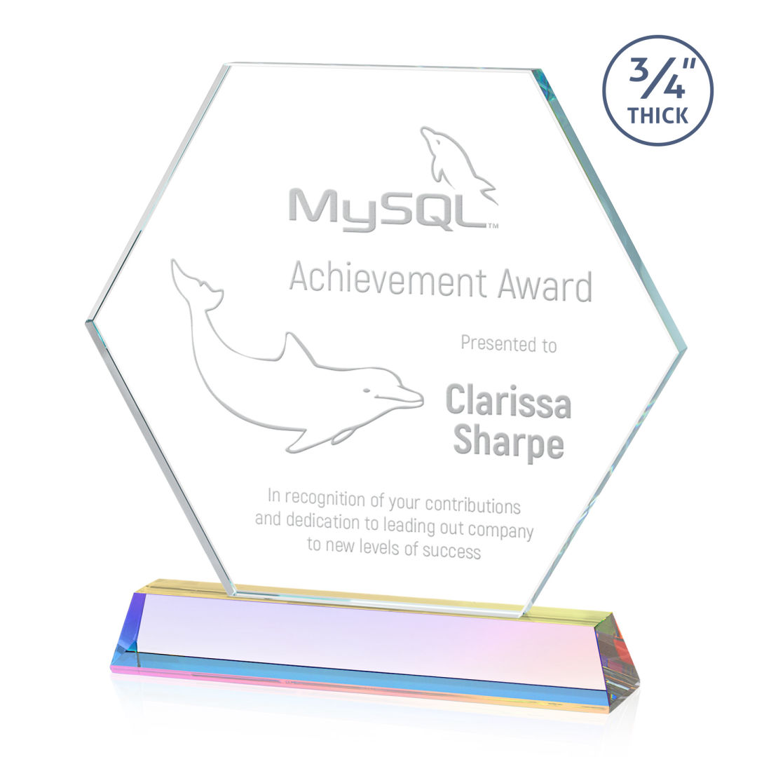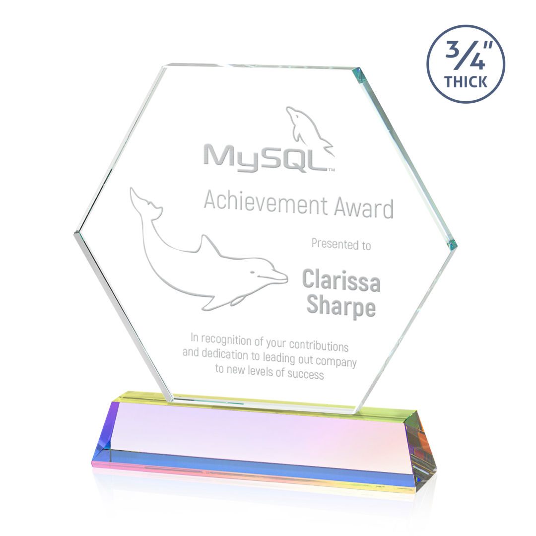 The Ralston Optical Crystal Award on a tall tapered optical base in our choice of 9 distinct colors. Featuring a large hexagonal crystal display with your magnificent achievement permanently deep etched by hand. Second position etch and colorfill optional. 6.875″ W x 7.5″ H x 2.0″ D