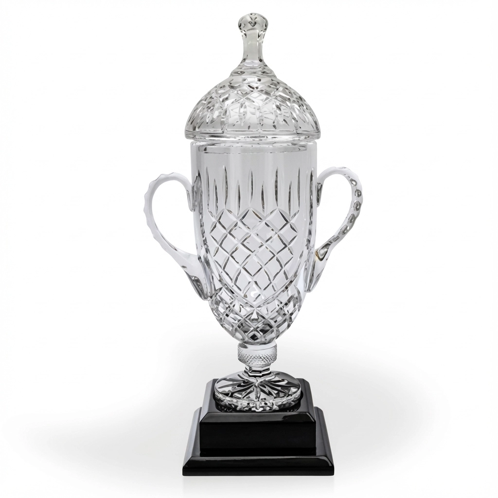 The majestic Rank Crystal Trophy Award makes quite a statement with its height and brilliantly cut lead crystal, including an elegant lid. This unique trophy makes a perfect award or corporate gift to commemorate significant achievements and recipients, or corporate teams and special events. 24% Lead Crystal made in Poland. 18″ H x 10.375″ W x 6″ Diameter