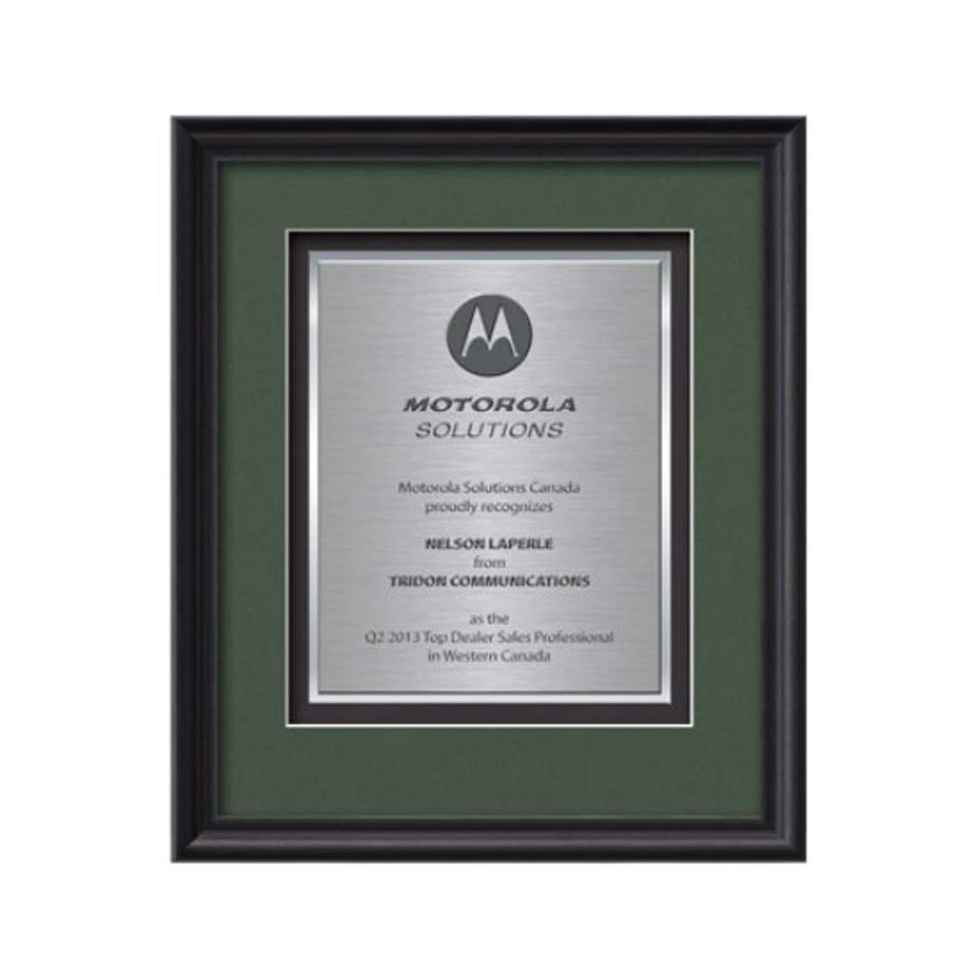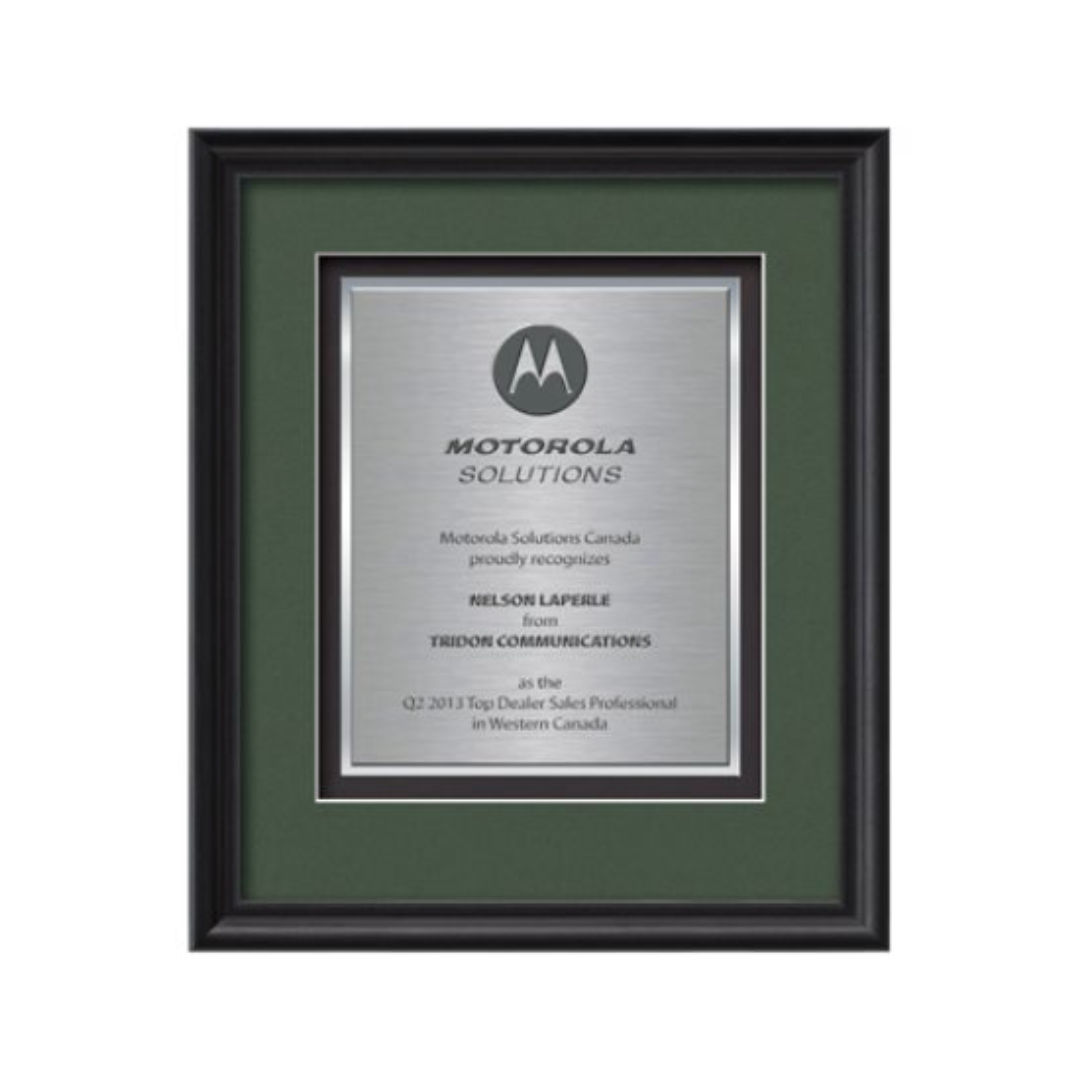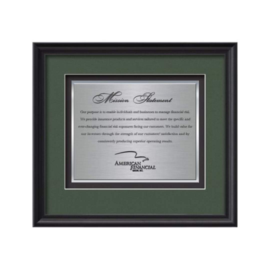 Commemorate a milestone achievement with Waterleaf Studios’ Certificate collection. Honor years of service, display diplomas, service awards, company mission statements, mergers & acquisitions or extraordinary achievements with these impressive statements of accomplishment. Your words of recognition are reproduced using our polished edged Double Plated TexEtch process with your choice of 2 standard mattes and framed in our museum quality Baron molding. 15.5″ W x 14.0″ H