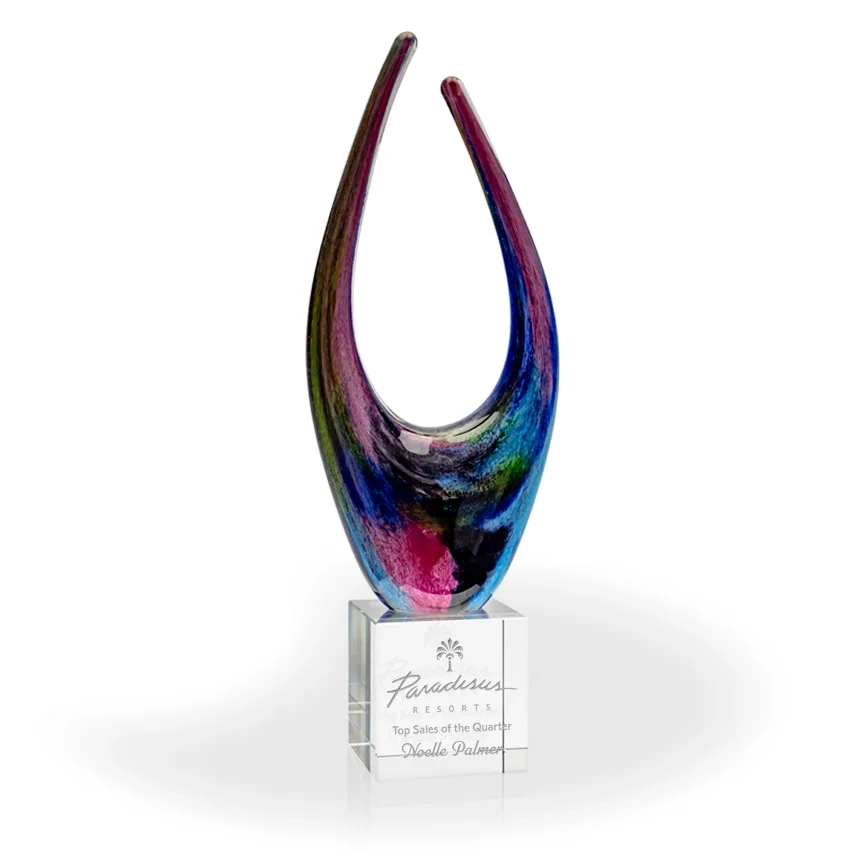 The Reaching Art Glass Award is a multi color, hand blown piece of art. With its two upward reaching “arms” it gives the feeling of reaching a goal, rising to meet a challenge, or working toward a big goal. The art glass is hand blown and features multiple colors in the glass (each piece will vary in color). Art glass awards are hand blown, and each piece will be slightly different in color, shape, and size. Bubbles and swirls are a part of the process and are considered normal and acceptable. 15″ H x 5.5″ W x 3.25″ D