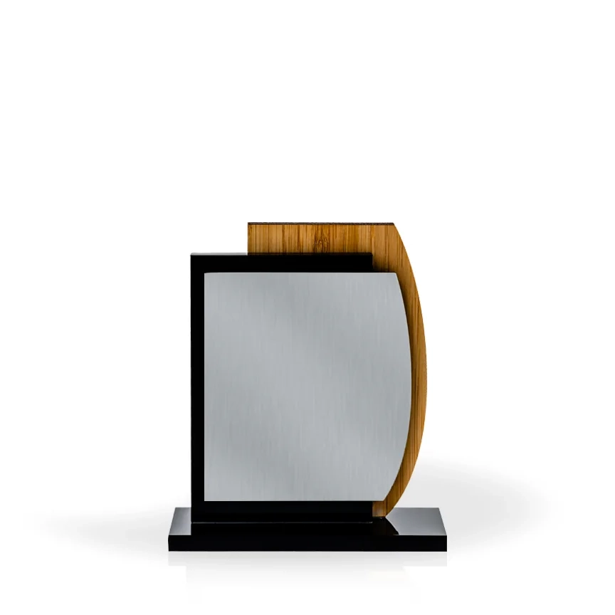 The Regal Acrylic and Bamboo Award is unique in that it features black acrylic with a silver plastic plate and bamboo wood accent, mixing the three design elements for a classy, updated award look. The front is UV printed to showcase brands and award information, including logos, award title and awardee name. This stunning award is the perfect choice for recognizing top sales, customer service goals, team awards, grand openings, and more. 6.875″ H x 6″ W x 2″ D