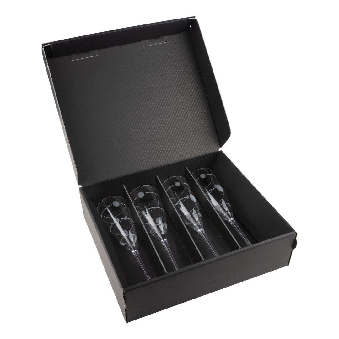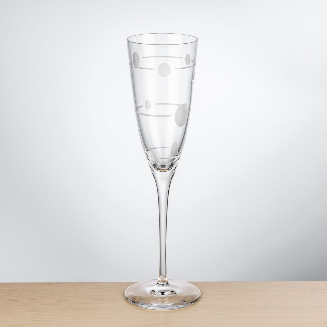 The Reverie Flute (5.75 oz) features a slender, elongated bowl that gracefully tapers upward, enhancing carbonation and aroma for an elegant champagne experience. Crafted from lead-free crystalline, it is accented with a subtle etched dot and linear pattern that wraps around the bowl, adding visual interest without overpowering its refined silhouette. Finished with a long, delicate stem and balanced base, this flute offers timeless sophistication for celebrations and special occasions. 2.75″ W x 9.25″ H