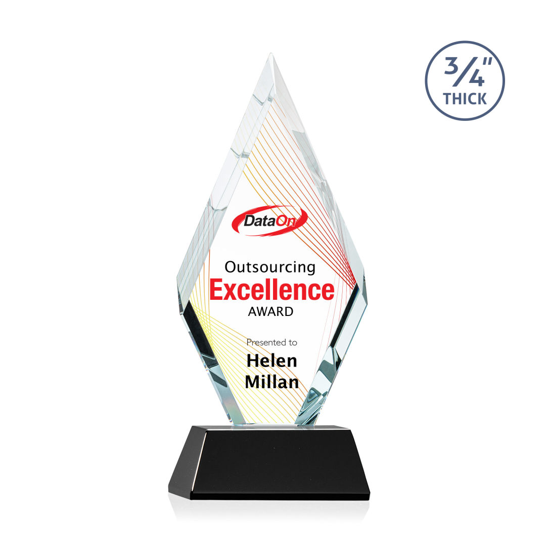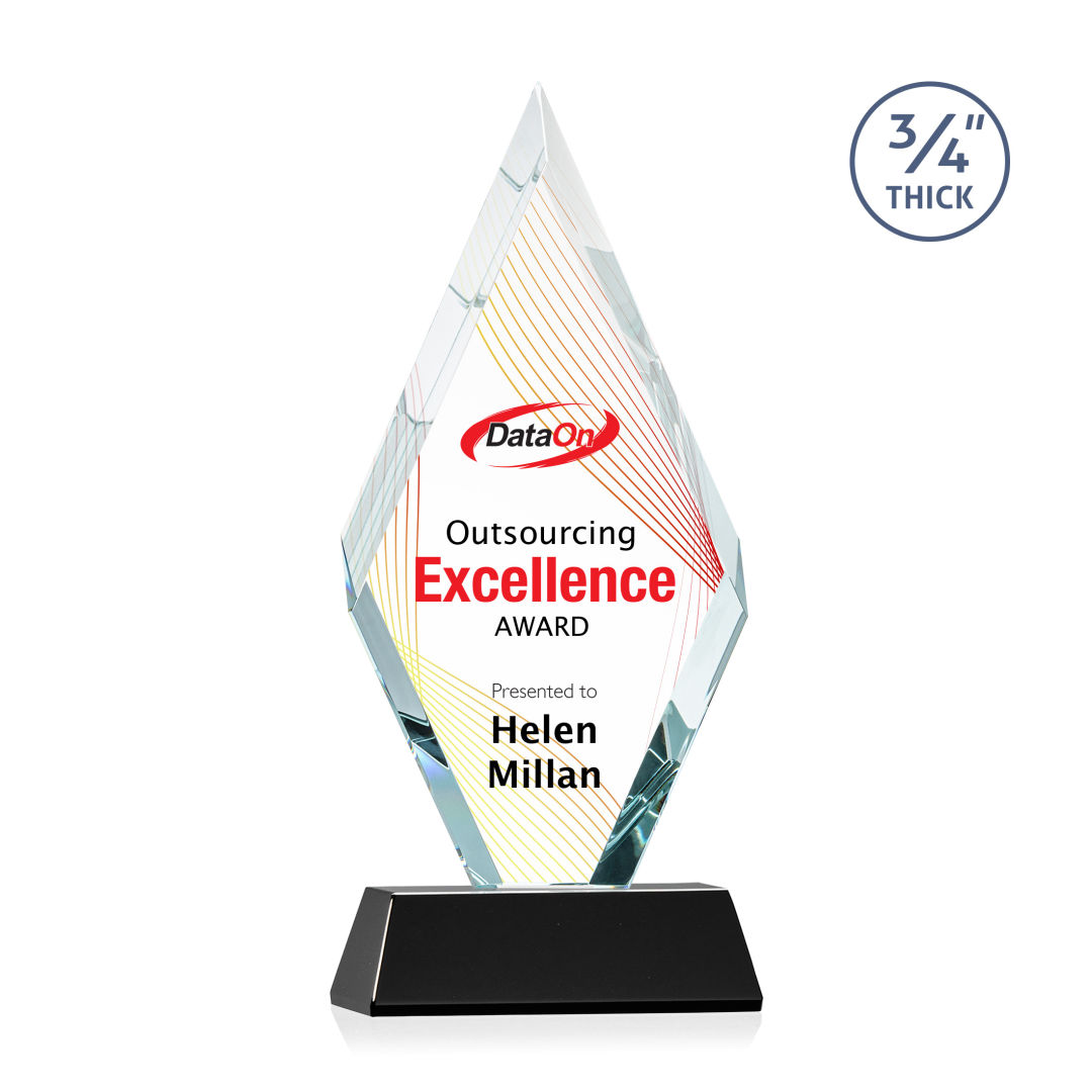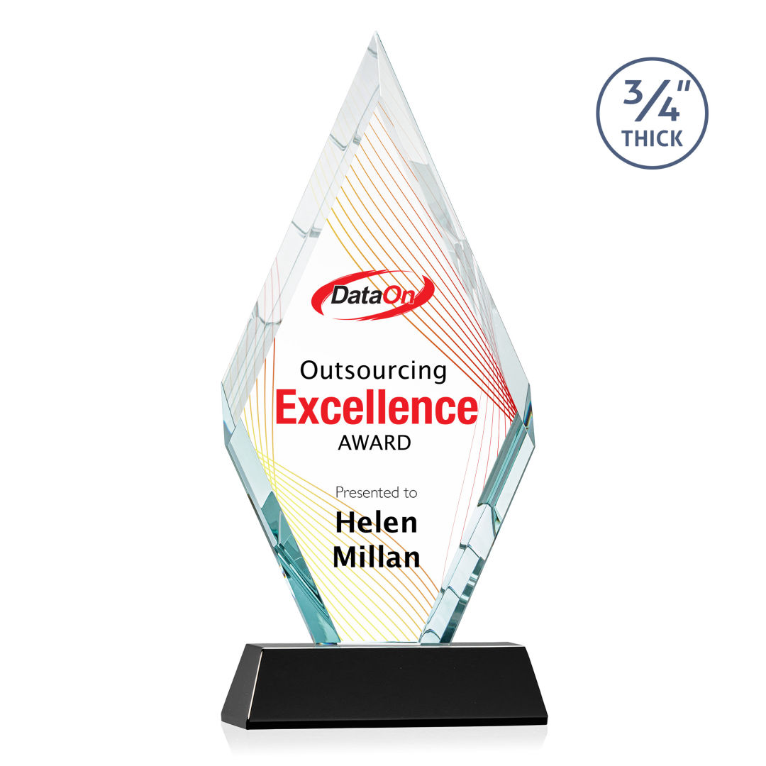 With beautiful interchanging beveled edges, the Starfire Crystal Richmond VividPrint™ Award is an elegant recognition piece for any occasion. Mounted on a tall tapered crystal base in your choice of 8 distinct colors. Second position imprint on base is optional. 4.0″ W x 9.5″ H x 2.0″ D