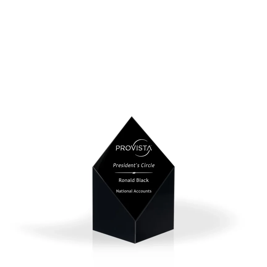 The Rio Black Diamond Crystal Award is made of gorgeous black crystal. It is a classic award shape and makes an excellent option when you have a wide variety of individuals to recognize in your award program. There are 3 sizes in the Rio Black Diamond Award line: 5″ tall, 7″ tall and 9″ tall, making this a great award to use if you want to create a category with multiple sizes for varying levels of recognition. It is very popular for sales awards, vendor awards, management awards, and a variety of department and staff awards. 5″ H x 3.75″ W x 2.75″ D