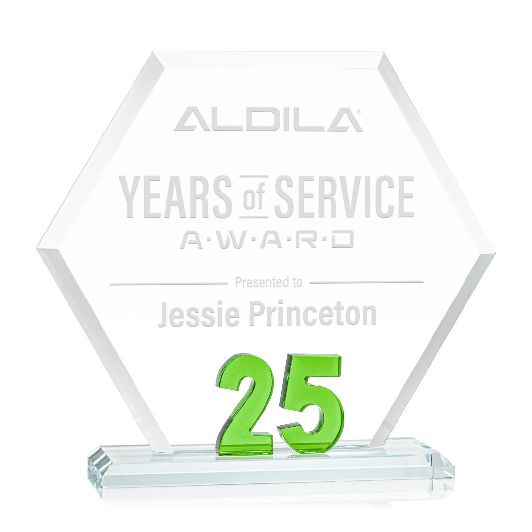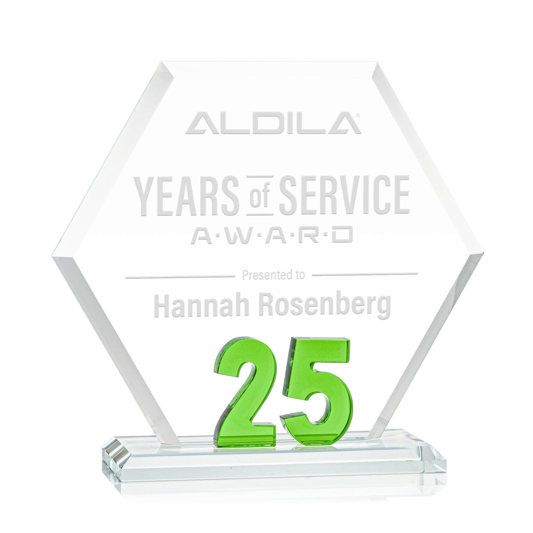 Mark a milestone in your organization with our Starfire Crystal Riviera Anniversary Award. The unique hexagonal design, coupled with beveled edges, creates a modern and sophisticated aesthetic, reflecting the significance of the years served. At the heart of this remarkable award lies captivating emerald green number 5, showcasing the years of significance. Mounted on a clear beveled Starfire Crystal base. 7.0″ W x 6.5″ H x 3.0″ D