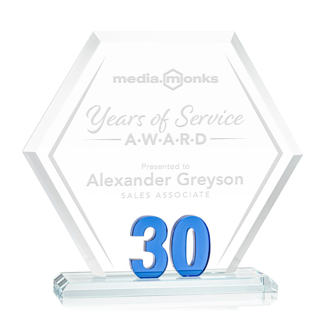 Mark a milestone in your organization with our Starfire Crystal Riviera Anniversary Award. The unique hexagonal design, coupled with beveled edges, creates a modern and sophisticated aesthetic, reflecting the significance of the years served. At the heart of this remarkable award lies captivating sapphire blue number 30, showcasing the years of significance. Mounted on a clear beveled Starfire Crystal base. 7.0″ W x 6.5″ H x 3.0″ D
