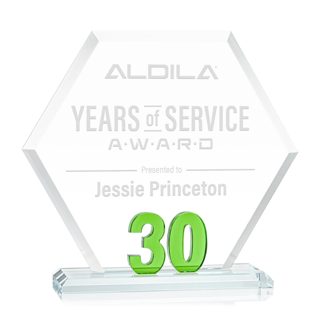 Mark a milestone in your organization with our Starfire Crystal Riviera Anniversary Award. The unique hexagonal design, coupled with beveled edges, creates a modern and sophisticated aesthetic, reflecting the significance of the years served. At the heart of this remarkable award lies captivating emerald green number 5, showcasing the years of significance. Mounted on a clear beveled Starfire Crystal base. 7.0″ W x 6.5″ H x 3.0″ D