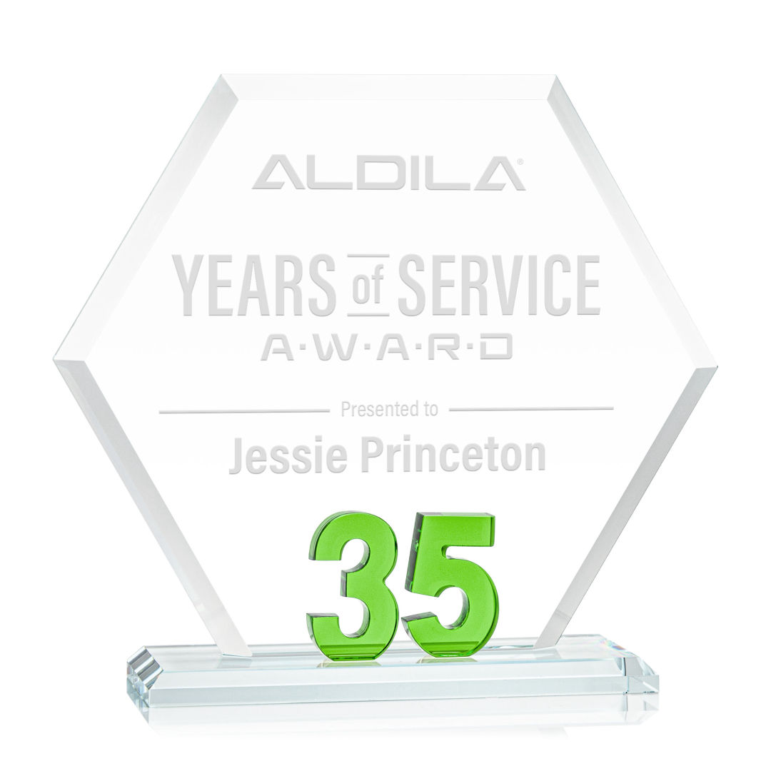 Mark a milestone in your organization with our Starfire Crystal Riviera Anniversary Award. The unique hexagonal design, coupled with beveled edges, creates a modern and sophisticated aesthetic, reflecting the significance of the years served. At the heart of this remarkable award lies captivating emerald green number 5, showcasing the years of significance. Mounted on a clear beveled Starfire Crystal base. 7.0″ W x 6.5″ H x 3.0″ D