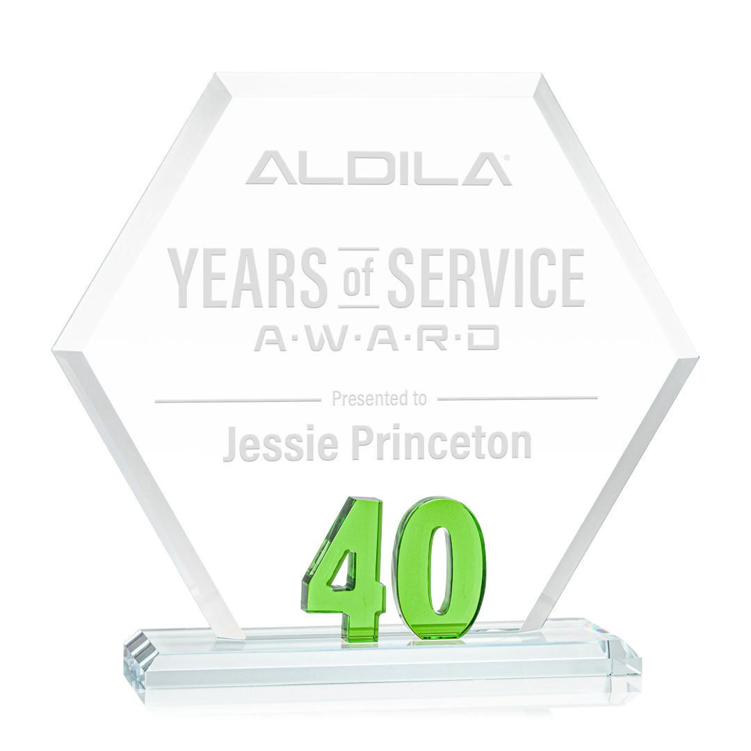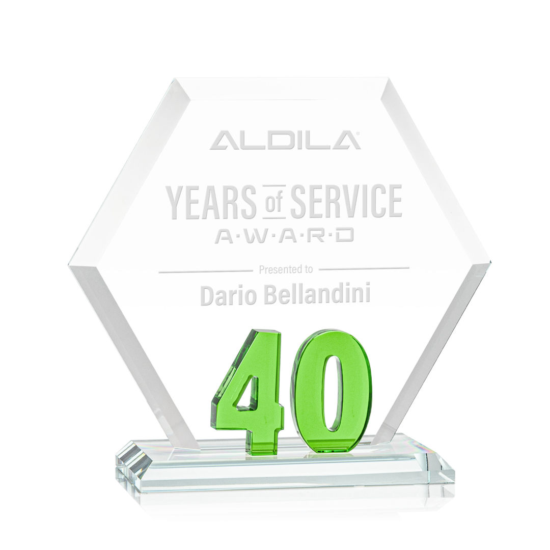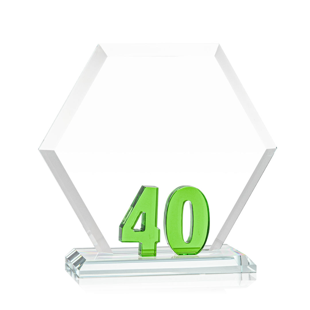 Mark a milestone in your organization with our Starfire Crystal Riviera Anniversary Award. The unique hexagonal design, coupled with beveled edges, creates a modern and sophisticated aesthetic, reflecting the significance of the years served. At the heart of this remarkable award lies captivating emerald green number 5, showcasing the years of significance. Mounted on a clear beveled Starfire Crystal base. 7.0″ W x 6.5″ H x 3.0″ D