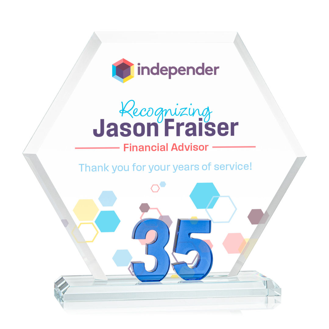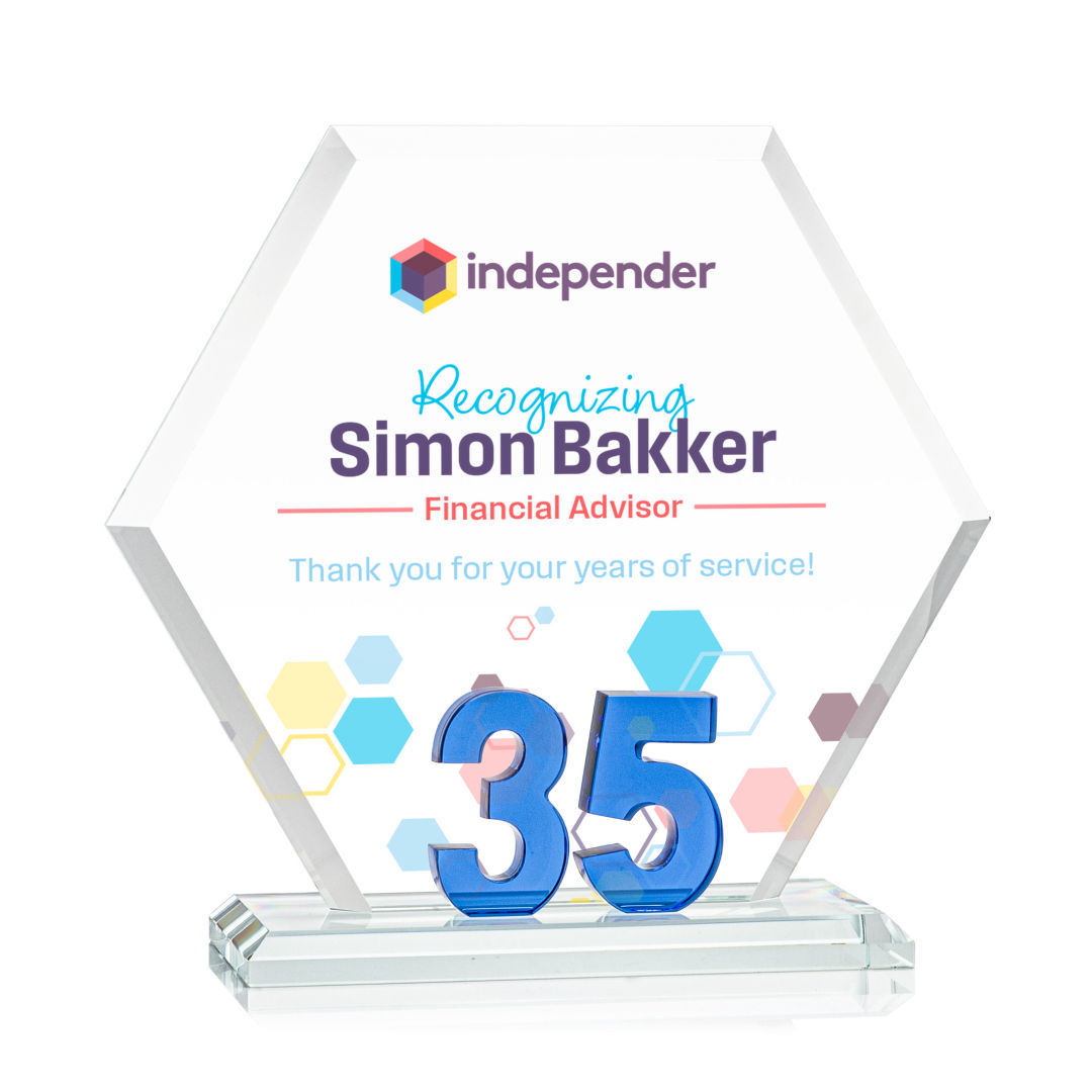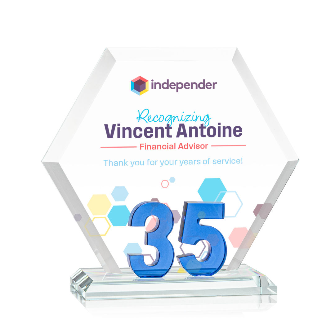 Mark a milestone in your organization with our Starfire Crystal Riviera Anniversary VividPrint™ Award. The unique hexagonal design, coupled with beveled edges, creates a modern and sophisticated aesthetic, reflecting the significance of the years served. At the heart of this remarkable award lies captivating sapphire blue number 35, showcasing the years of significance. Mounted on a clear beveled Starfire Crystal base. 7.0″ W x 6.5″ H x 3.0″ D