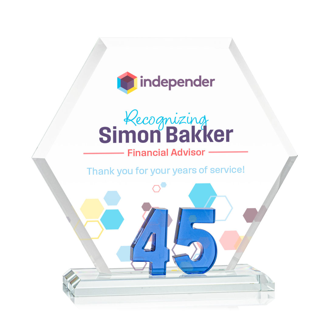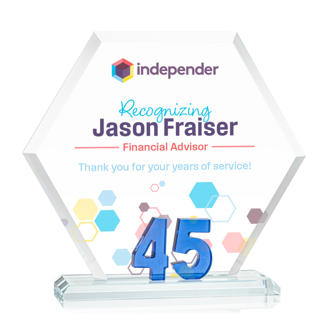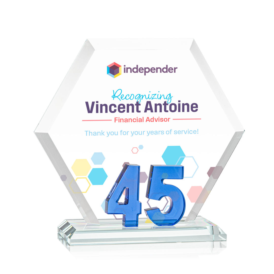 Mark a milestone in your organization with our Starfire Crystal Riviera Anniversary VividPrint™ Award. The unique hexagonal design, coupled with beveled edges, creates a modern and sophisticated aesthetic, reflecting the significance of the years served. At the heart of this remarkable award lies captivating sapphire blue number 45, showcasing the years of significance. Mounted on a clear beveled Starfire Crystal base. 7.0″ W x 6.5″ H x 3.0″ D