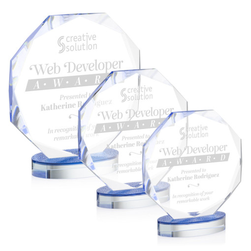 This uniquely designed Starfire Crystal Romsley Award combines a classic octagonal shape with intricate bevels to create a distinguished and timeless recognition piece. Mounted on an oval base that features a unique textured sapphire top that is crafted to catch and refract light, creating a mesmerizing play of brilliance. 6.25″ W x 7.125″ H x 2.375″ D