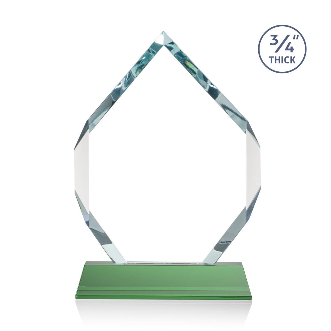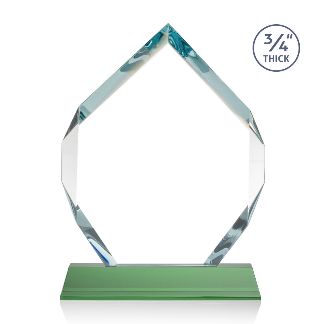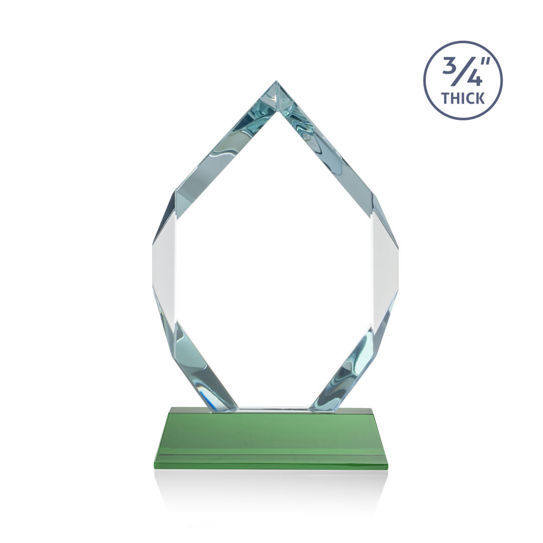 The Royal Diamond is a symmetrical six-sided Starfire award with constant-width bevels on the front top and bottom sides and on the back middle sides. The prominent, highly polished bevels accentuate the sparkle of the glass, generate diverse and attractive reflections along the edges, and frame the central etching area. Mounted on a tall tapered optical crystal base. Second Position Etch & Colorfill Optional. 5.0″ W x 8.0″ H x 2.0″ D